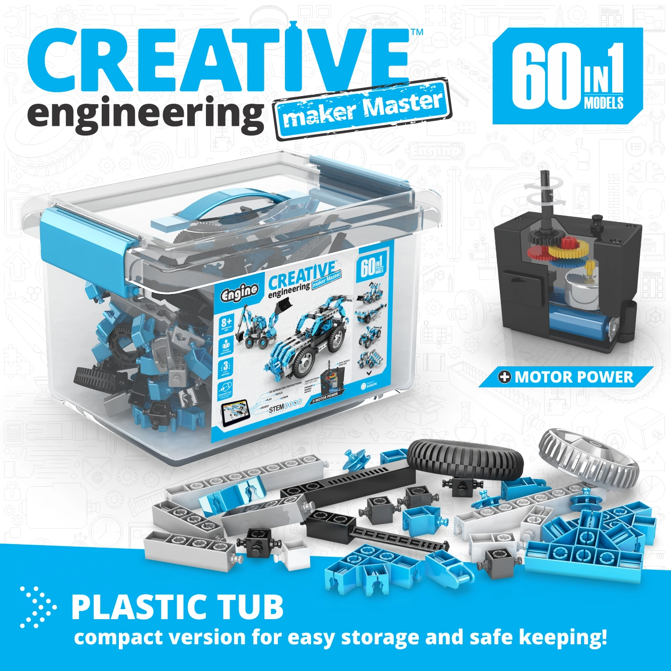 Descubre el creativo set de construcción ENGINO Motorized Maker 60 en 1, que desarrolla el pensamiento lógico, la imaginación espacial y las habilidades STEM. Con 223 piezas (el paquete también indica 189 piezas para proyectos) construirás hasta 60 modelos técnicos – desde un Fórmula 1 hasta una excavadora o una nave espacial – y gracias al motor con caja de engranajes además los pondrás en movimiento.