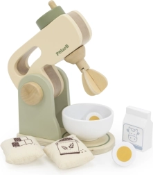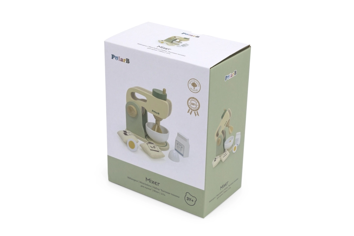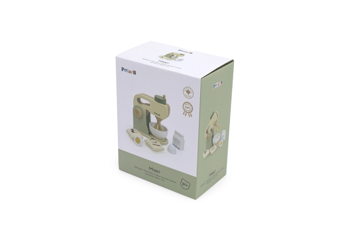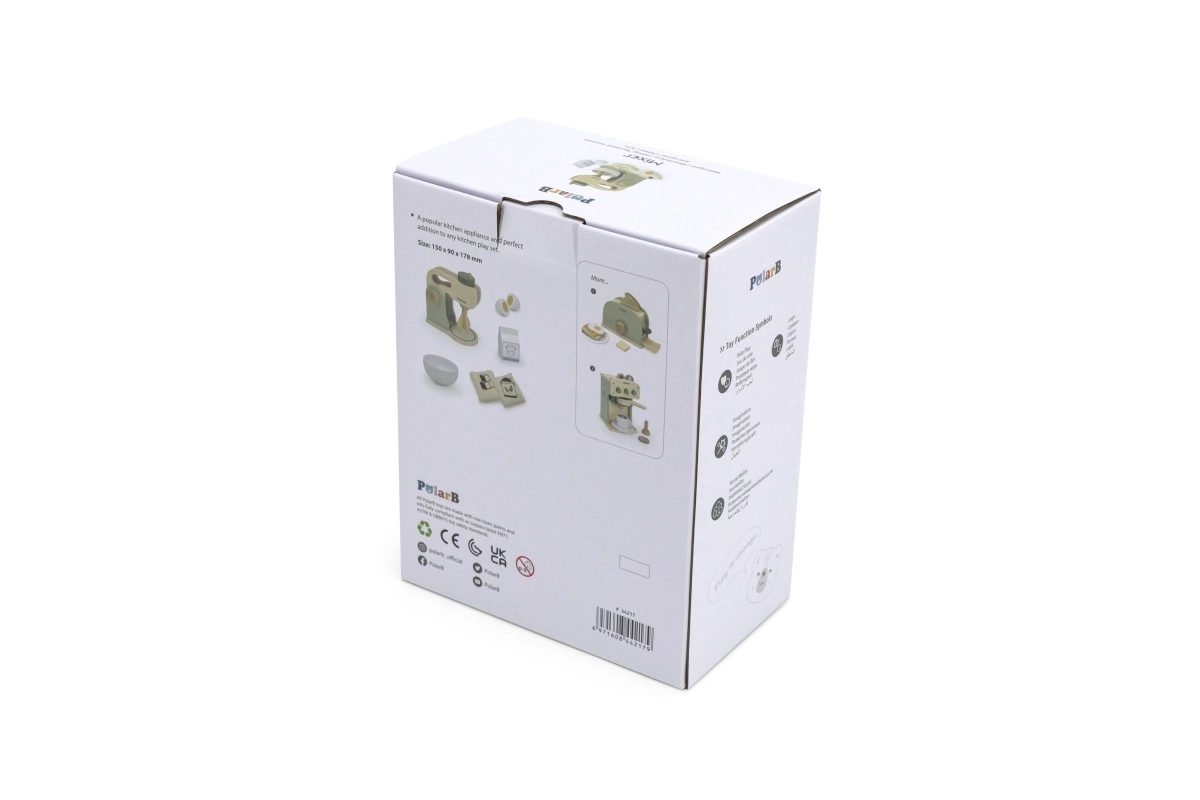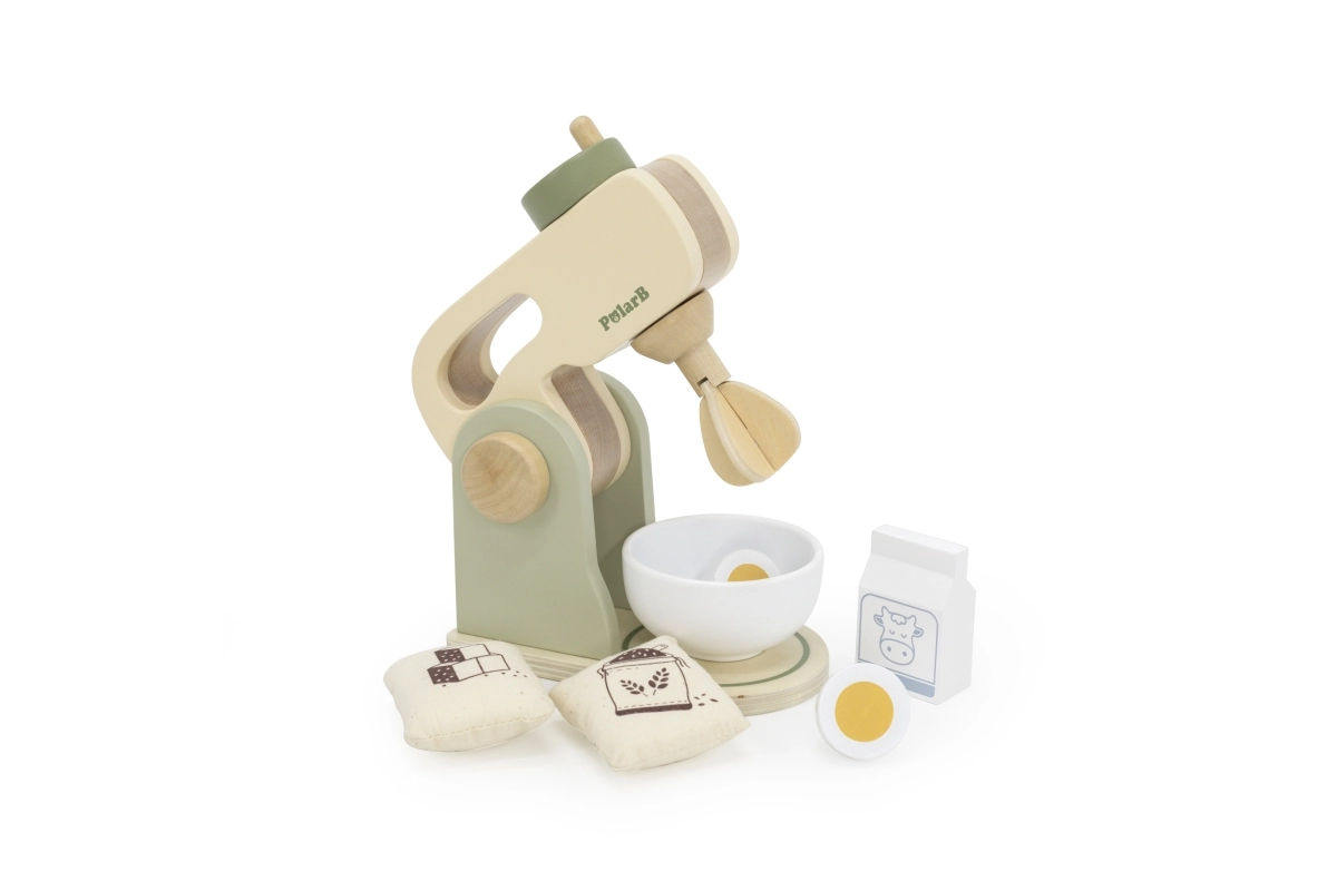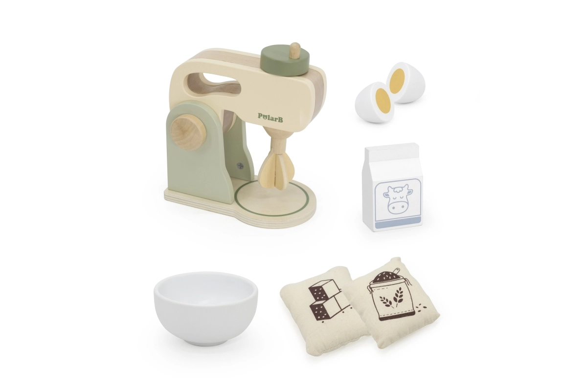 PolarB batidora de cocina de madera no solo es un bonito complemento para la cocinita infantil, sino también un juguete que ayuda a desarrollar habilidades y creatividad. Con un brazo abatible para colocar y retirar fácilmente el bol, un mando giratorio y una batidora que rota, imita a la perfección los electrodomésticos de cocina reales.