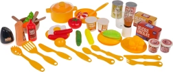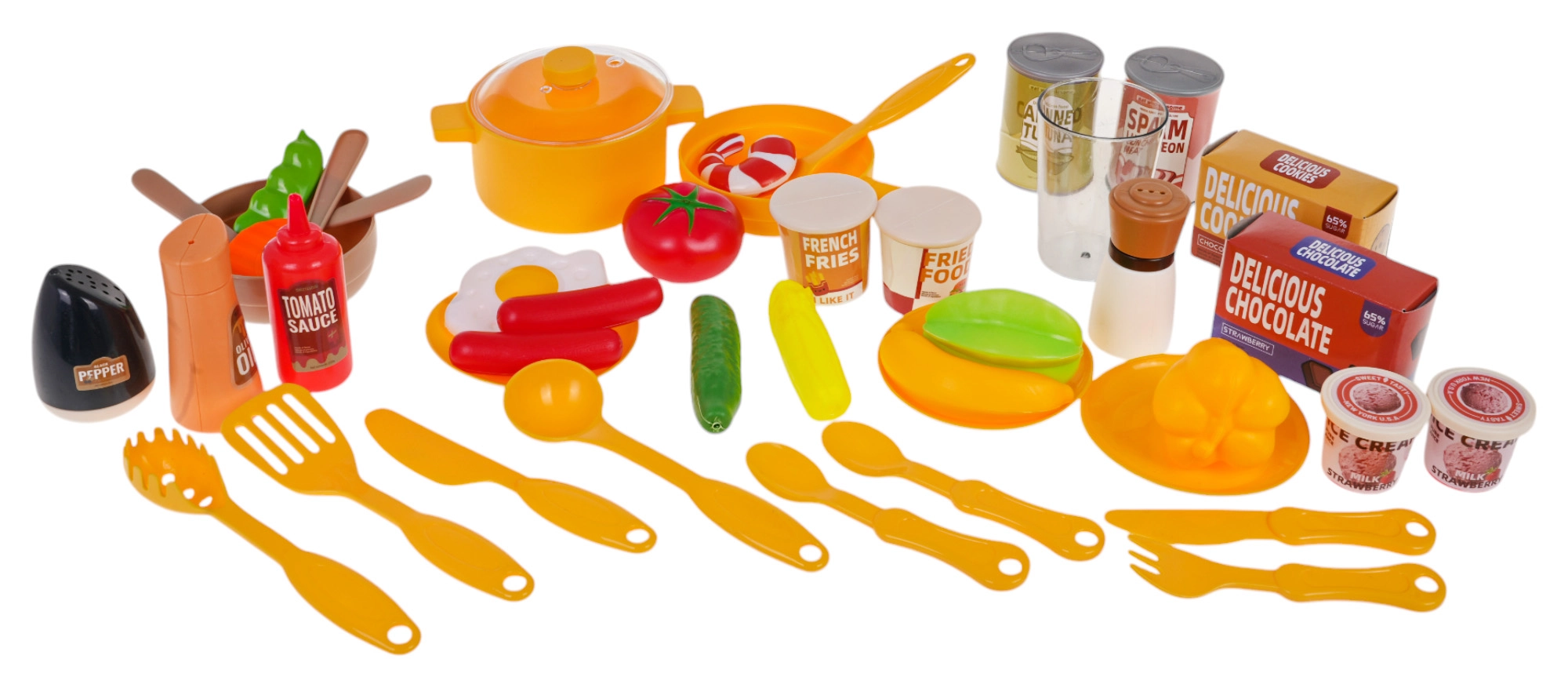 Sartén, olla, platos, cubiertos, especias y alimentos de juguete: todo cuidadosamente combinado para horas de juego creativo.