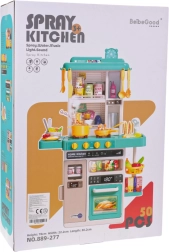 Esta cocina infantil ofrece un juego de cocina realista gracias a los quemadores iluminados, las perillas giratorias y los sonidos de fritura y cocción. De uno de los quemadores se libera un suave vapor de agua que intensifica la experiencia. El grifo con agua corriente permite a los pequeños chefs enjuagar los utensilios como en una cocina de verdad.