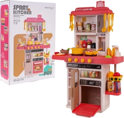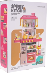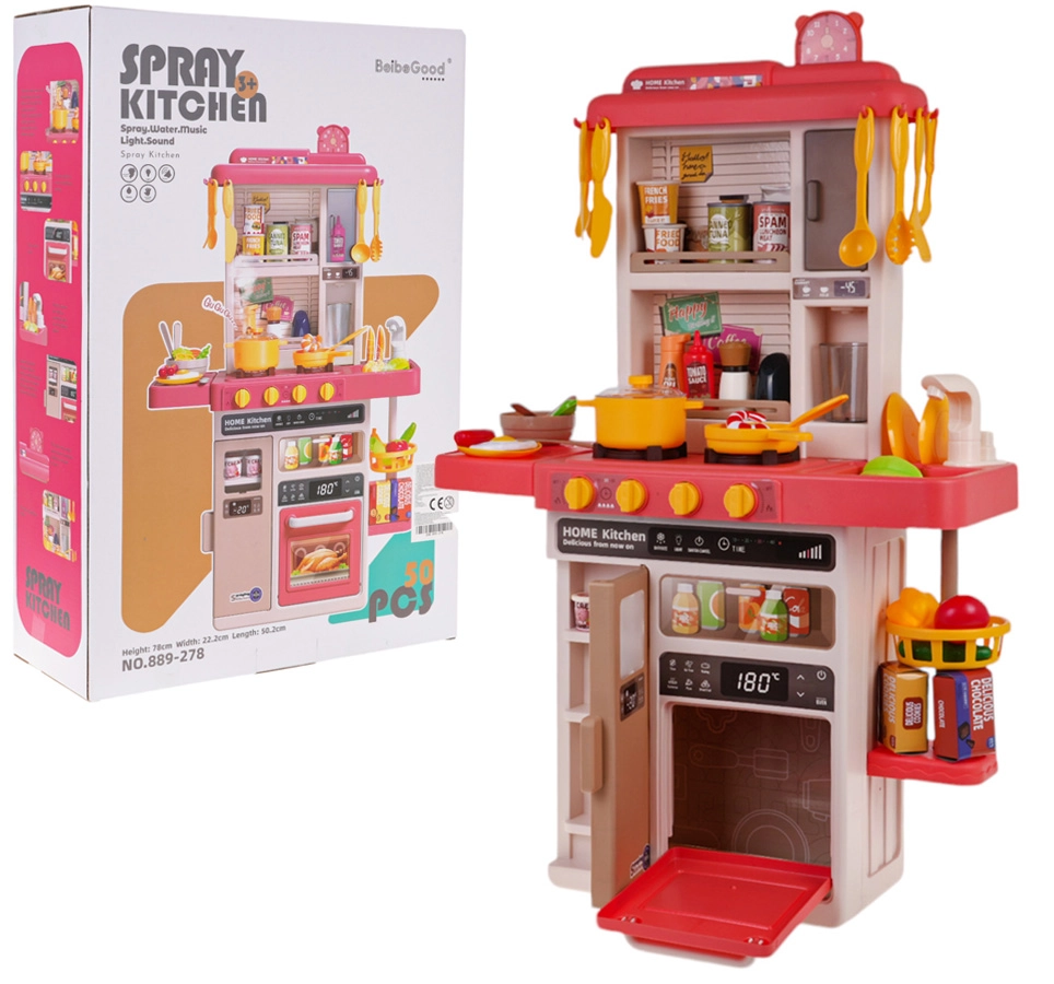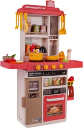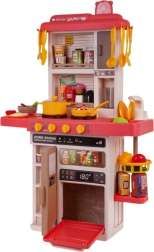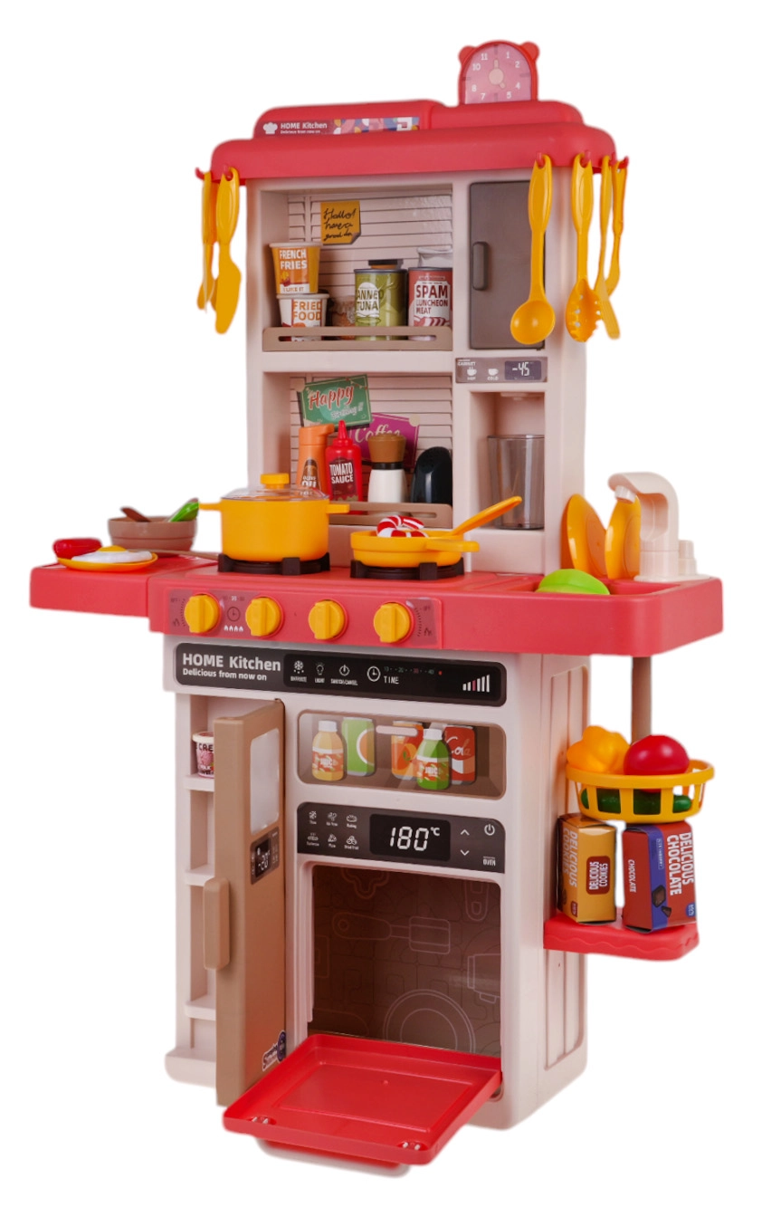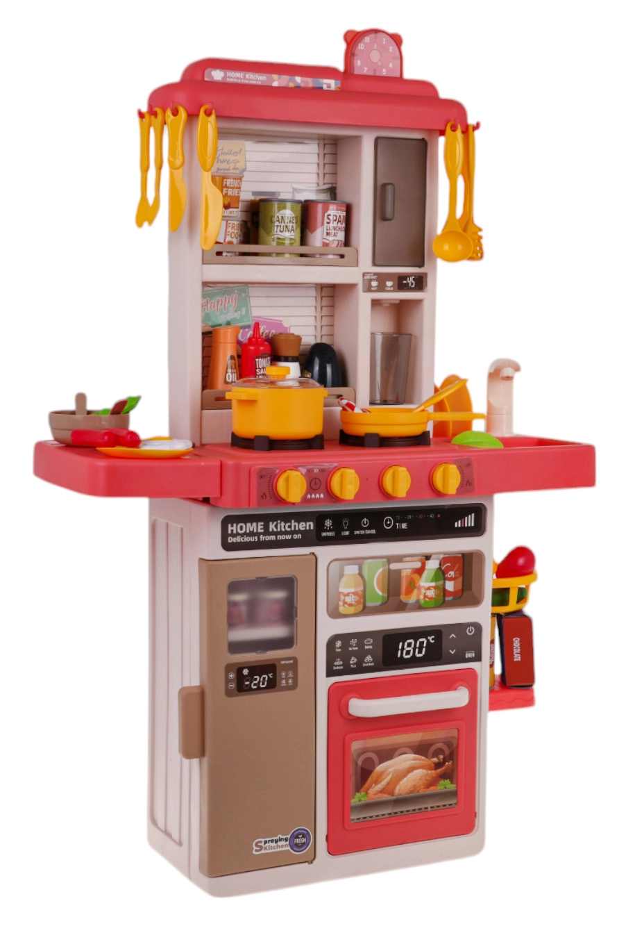 Amplia cocina infantil para pequeños chefs a partir de 3 años con efectos de luz y sonido, agua real que fluye del grifo y vapor seguro en el quemador. Rico equipamiento con 50 piezas, plástico de calidad en colores vivos y elementos funcionales como mandos giratorios, quemadores iluminados, horno y “nevera” abatibles que garantizan horas de juego creativo.