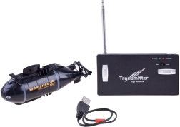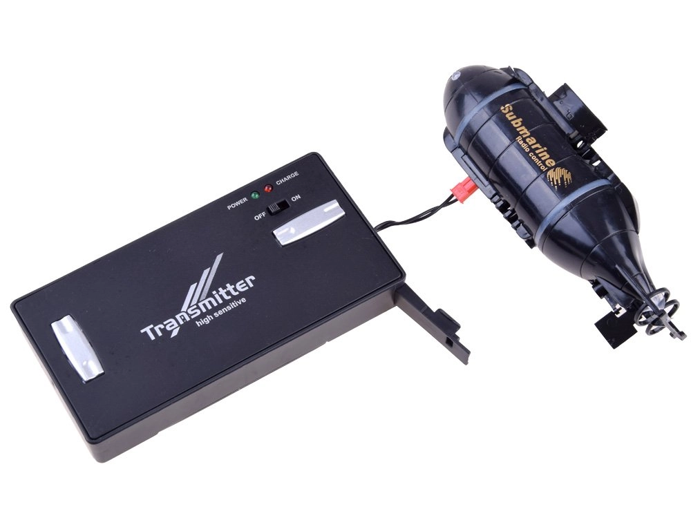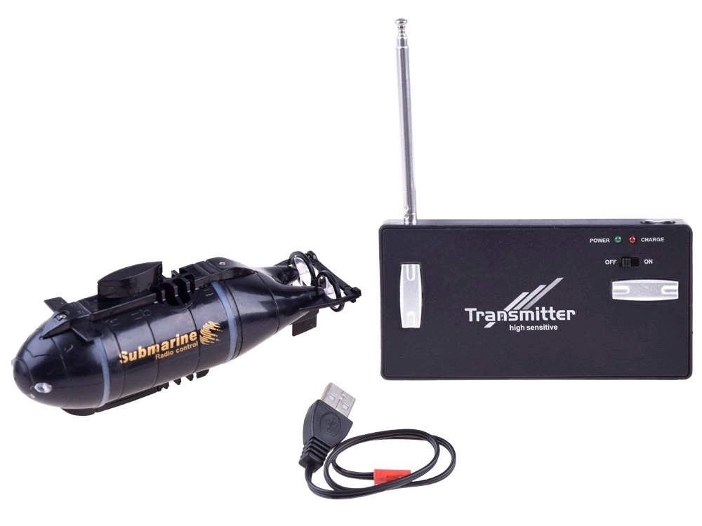El mando no solo sirve para dirigir, sino también como práctica cargador: basta con conectar el cable integrado a la parte frontal del submarino. Para jugar durante más tiempo, el paquete incluye un cargador USB. Dos luces LED delanteras mejoran la visibilidad y le dan un aspecto auténtico.