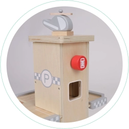 Incluye un helicóptero con helipuerto en la azotea, 4 cochecitos, estación de servicio y una barrera móvil para un juego realista. La construcción de madera de alta calidad sin bordes afilados garantiza un juego 100% seguro.