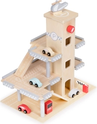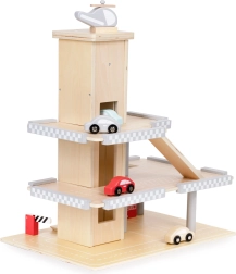 Descubre el garaje de madera de varios niveles con ascensor de ECOTOYS: el juguete perfecto para pequeños conductores. El set incluye 4 coches de colores y un helicóptero, 3 pisos con rampas, ascensor móvil, estación de servicio y barrera para regular el tráfico. Fabricado en madera resistente, seguro a partir de 3 años, con certificaciones CE y EN71.