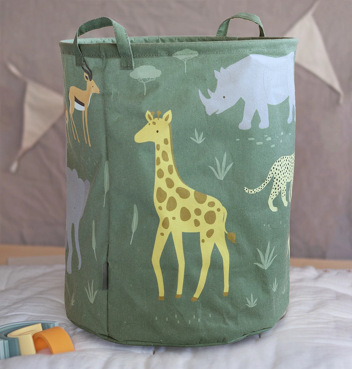 El elegante cesto de A Little Lovely Company con estampado de animales de la sabana ayuda a mantener juguetes, cojines y ropa en un solo lugar. Gracias al material resistente y al revestimiento interior de PE, mantiene la forma, no traspasa y se limpia con facilidad: basta con pasar un paño húmedo.