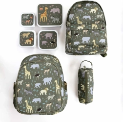 El motivo de animales de la sabana puede combinarse con otros accesorios como cajas para la merienda y estuche.