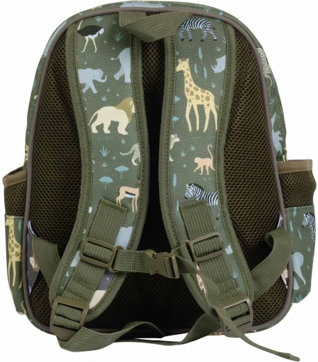 Mochila infantil con estilo y práctica con motivo de animales de la sabana, ideal para preescolar y excursiones. Ofrece un compartimento principal espacioso, un bolsillo frontal aislado para la merienda y dos bolsillos laterales para la botella. Para un transporte cómodo cuenta con tirantes acolchados, correa de pecho antideslizante y espalda acolchada y transpirable.