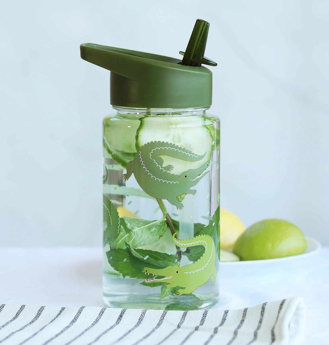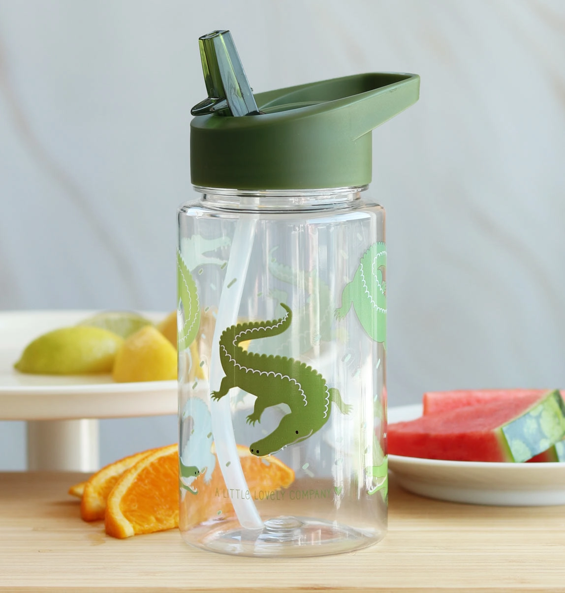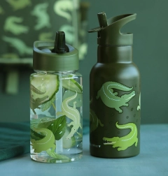 Esta botella de estilo moderno con motivo de cocodrilos ayuda a los niños a mantener una buena hidratación. Gracias al cierre firme y a la pajita, beber es cómodo y la botella se mantiene sin derrames. Las paredes transparentes ayudan a controlar la cantidad de líquido y sus dimensiones compactas caben en cualquier mochila infantil.