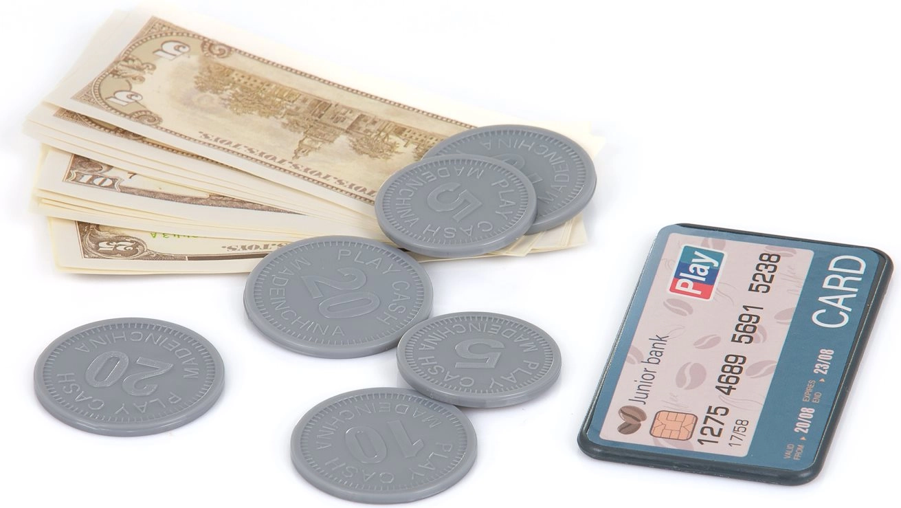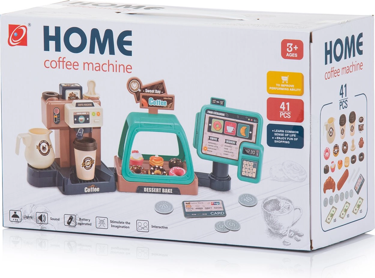El set incluye 41 piezas de accesorios, entre ellas cafetera, tazas, prensador de café, monedas, billetes, caja registradora y expositor para pasteles.
