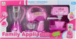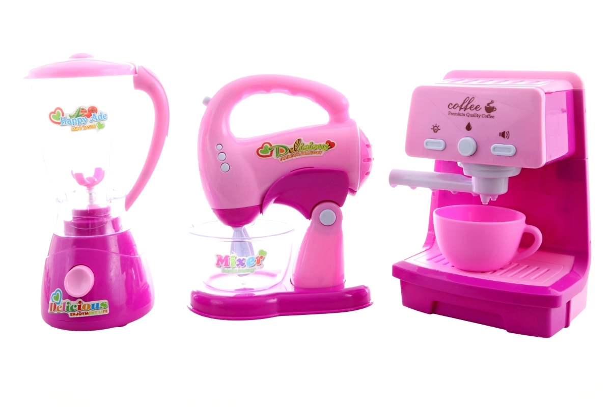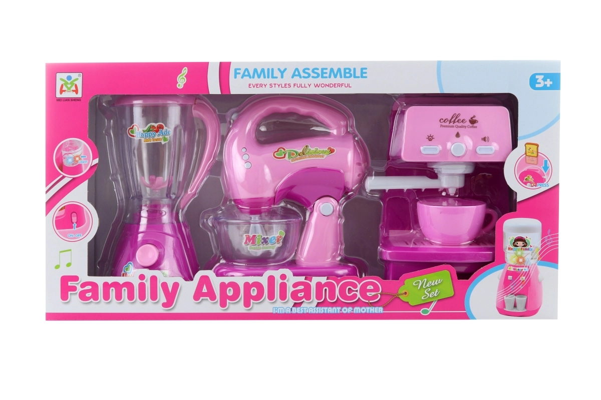 Incluye una cafetera con taza, una batidora de vaso con recipiente transparente y una batidora de mano con bol. Cada aparato funciona con 2× pilas AA (no incluidas). Todo el conjunto viene en una caja de regalo de aproximadamente 43 × 22 × 10 cm.