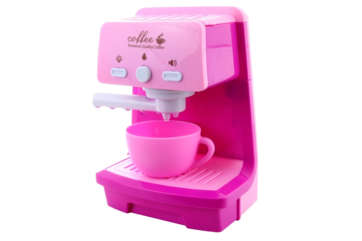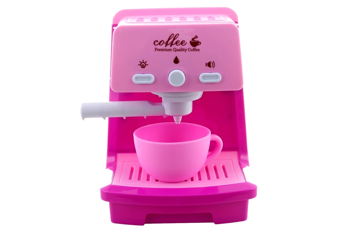 Cafetera infantil con efectos de luz y sonido, portafiltro y taza. El depósito se puede llenar con agua y bombearla manualmente, como en la preparación real de un espresso.