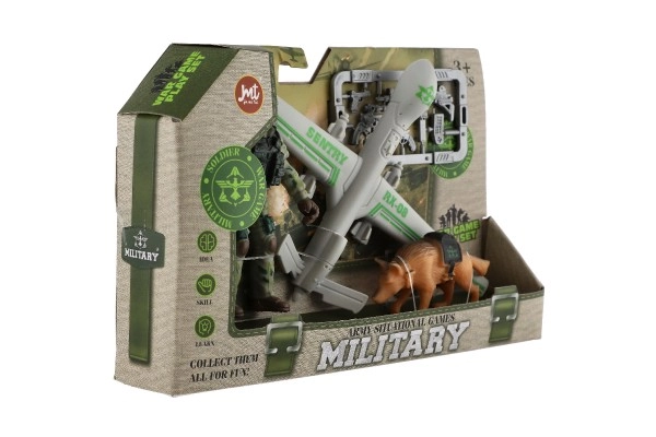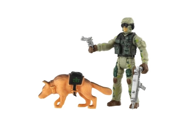 El perro, con arnés y accesorios, acompaña al soldado en cada misión, ideal para desarrollar el juego narrativo y el trabajo en equipo.