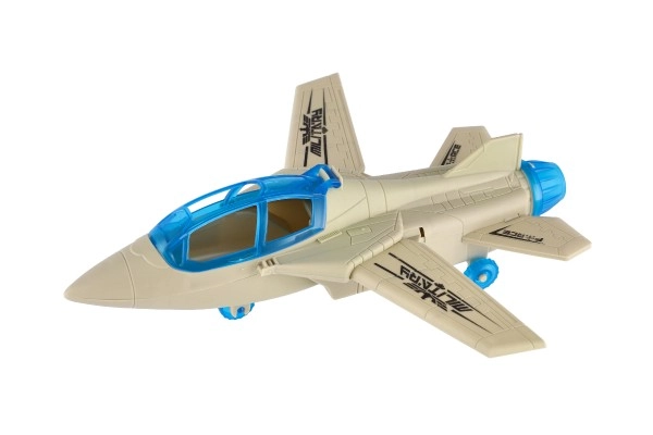 El caza cuenta con una cubierta de cabina azul que se puede abrir y armamento visible con puntas naranjas, ideal para un juego seguro y creativo.