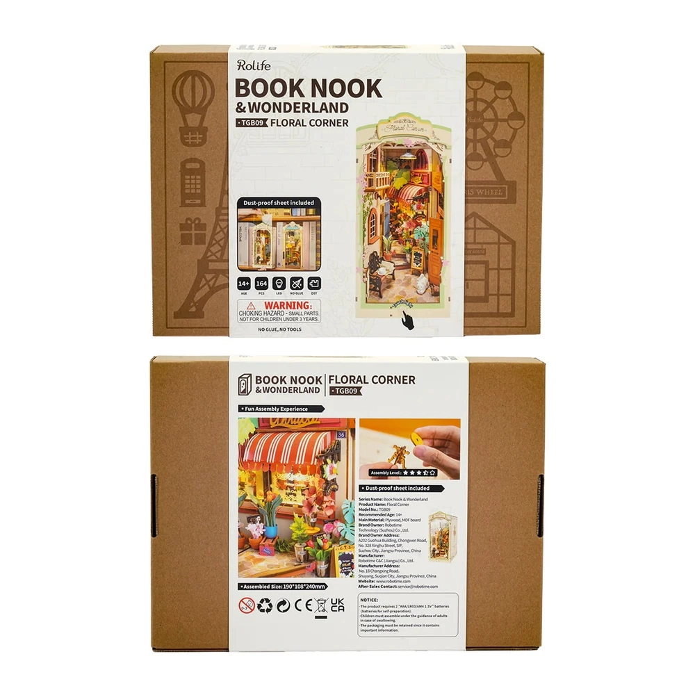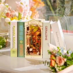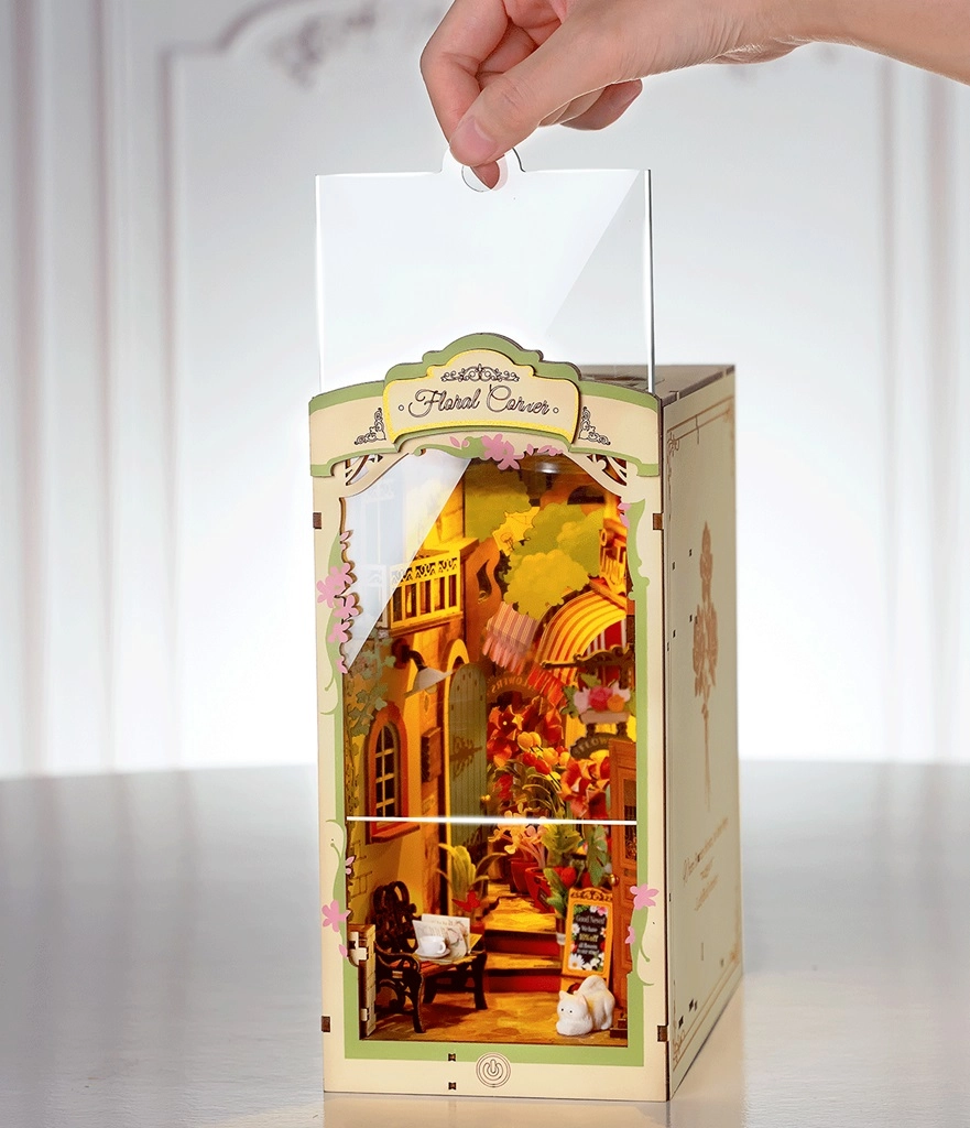 Descubre el encanto de un callejón de libros con una floristería en miniatura, donde no faltan paredes cubiertas de hiedra, ventanas arqueadas, balcón y un gato descansando. Las piezas están numeradas y encajan con precisión, para que disfrutes del proyecto sin experiencia previa, sin pegamento ni herramientas. La iluminación LED integrada ilumina cada detalle y convierte tu estantería en un rincón acogedor.