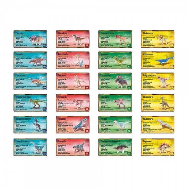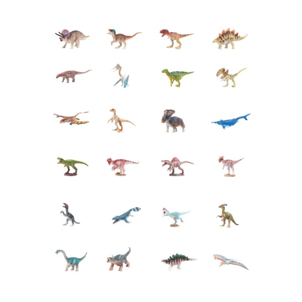 Completa la colección de 24 dinosaurios diferentes y amplía la imaginación infantil con aventuras de la era mesozoica. Los juguetes son aptos para niños a partir de 3 años y, gracias a sus dimensiones compactas, también son perfectos para llevar de viaje.