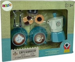 Este juego de café para niños en un precioso color turquesa es ideal para jugar a la cafetería o para recibir invitados en casa. El set incluye patrones de colores para el café, lo que permite a los pequeños baristas preparar café con diferentes decoraciones. La cafetera del set ayuda a que todo parezca profesional.