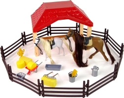 - El set incluye accesorios como triciclo, horquilla, comederos para comida y agua, así como heno.