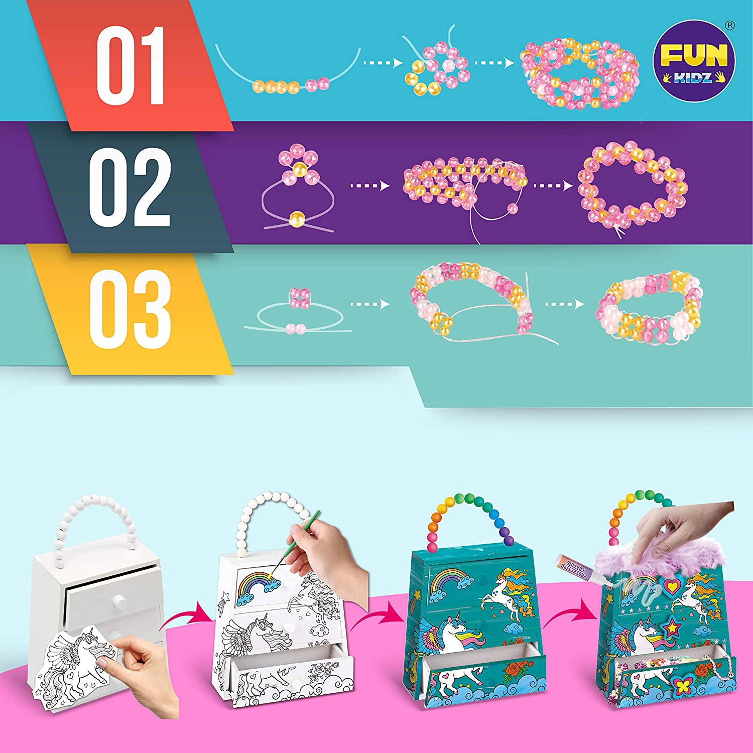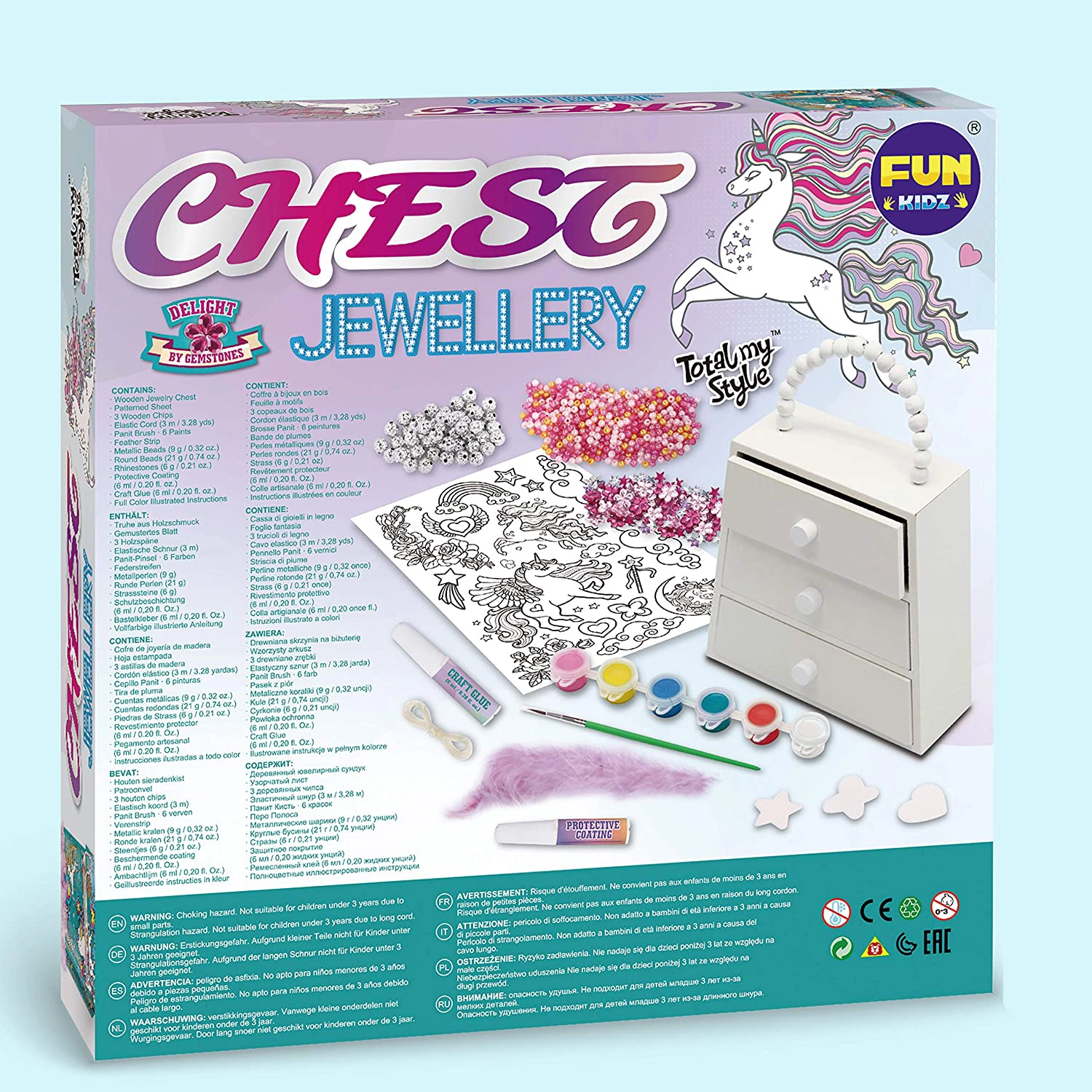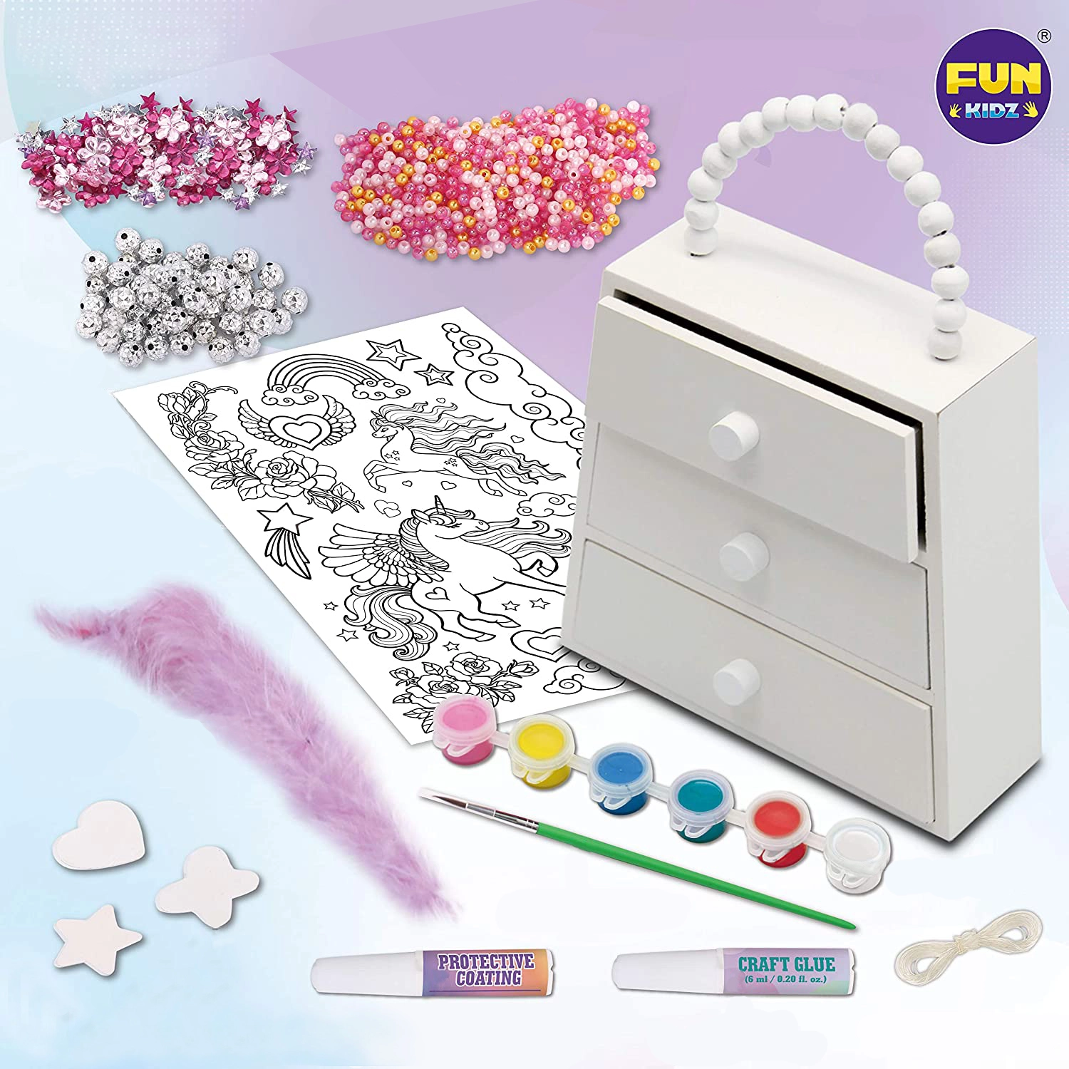 - El contenido del set incluye una caja de joyas de madera, pincel, 6 pinturas, cuerda, pegamento y una amplia gama de decoraciones.