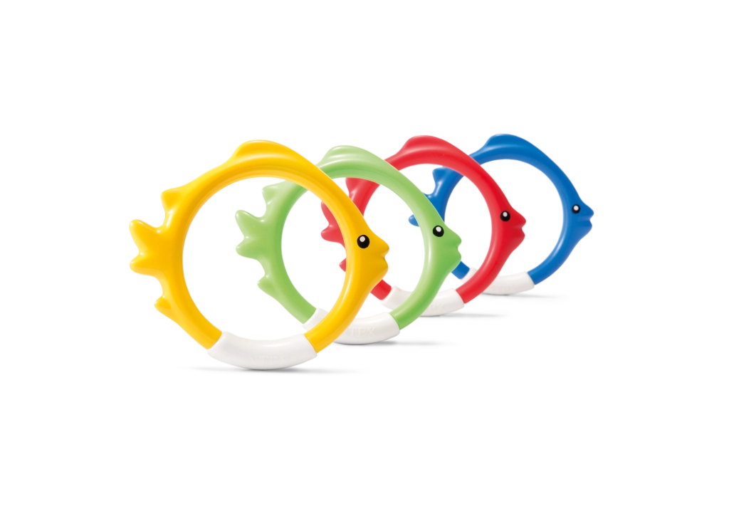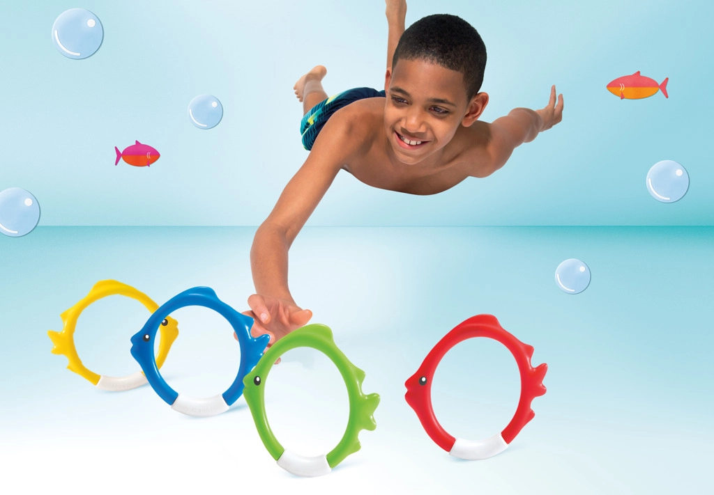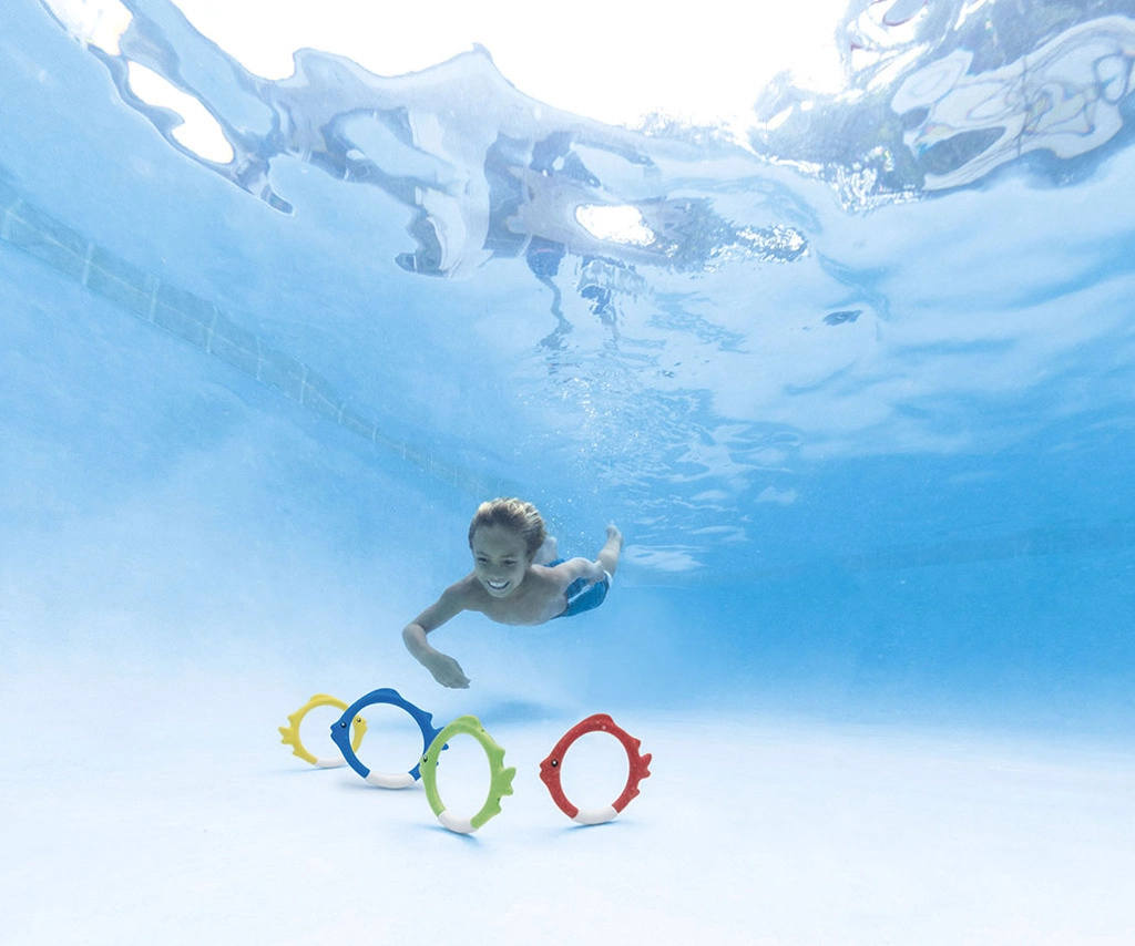 Al arrojarlos al agua, los aros se colocan automáticamente en el fondo, de modo que los niños tienen un objetivo claro para sumergirse y practican el buceo de forma natural y divertida.