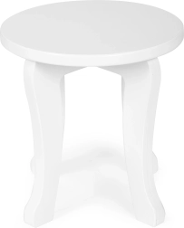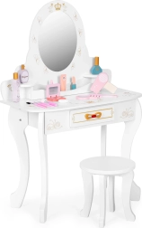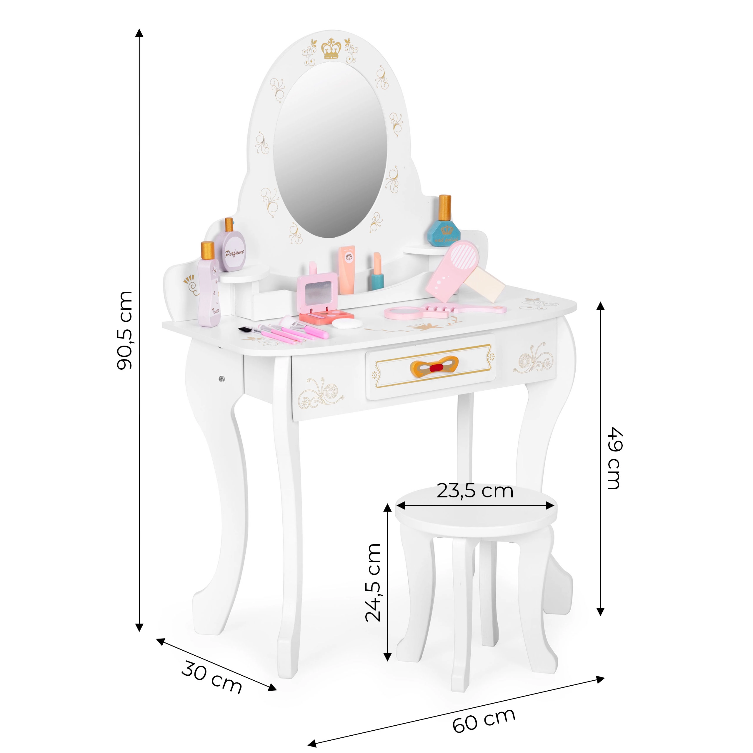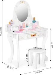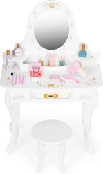 Tocador estable de madera y MDF con espejo decorativo y corona. Los bordes redondeados y el acabado cuidadoso garantizan un juego seguro para niños a partir de 3 años.