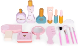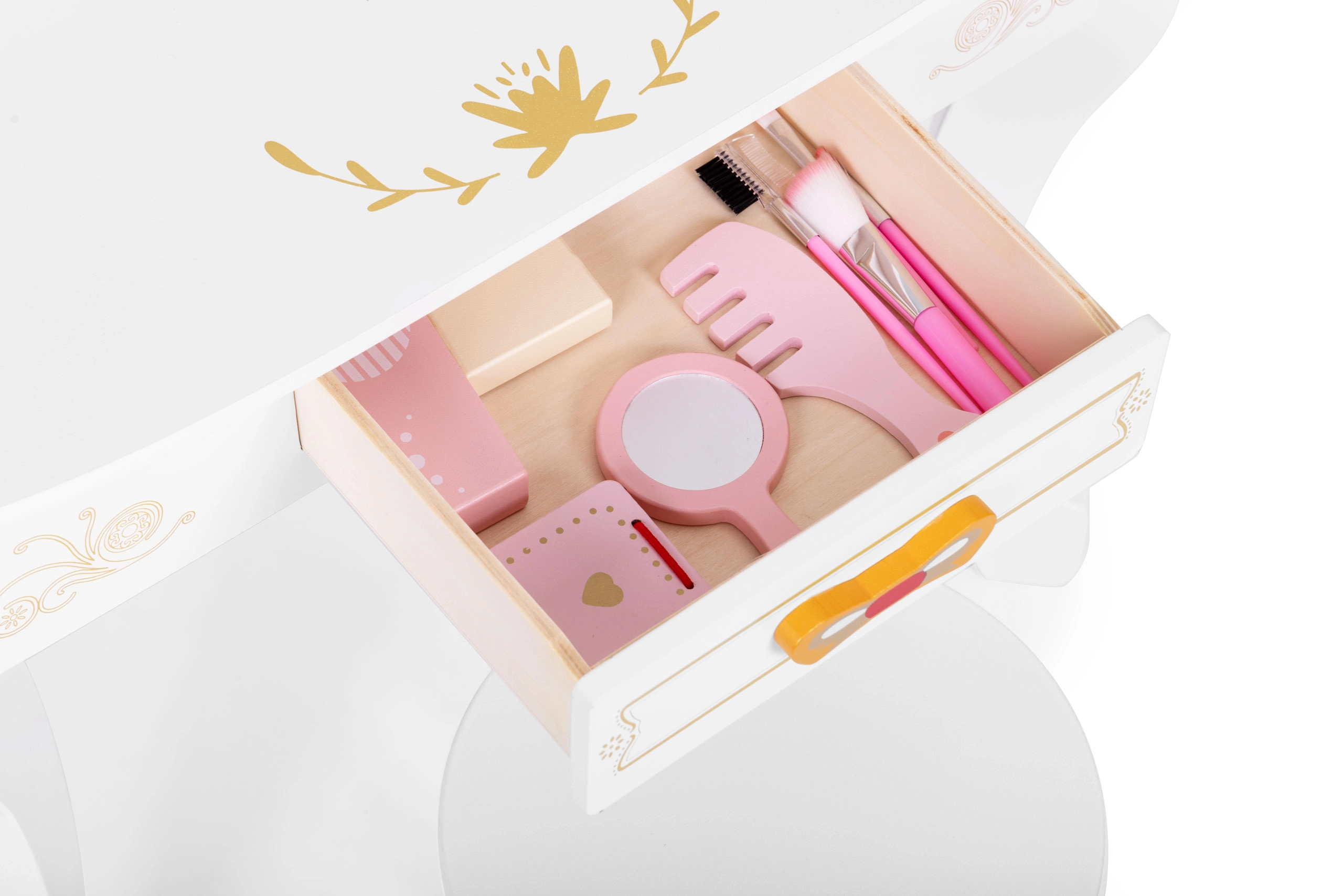 Incluye un set de juguetes de madera: accesorios de “cosmética”, con los que los niños pueden imitar los rituales matutinos de los adultos: secador, cepillo, pequeño espejo, juegos de “maquillaje” y brochas. Tras el juego, todo se guarda fácilmente en el espacioso cajón extraíble, manteniendo siempre ordenados el tocador y la habitación.