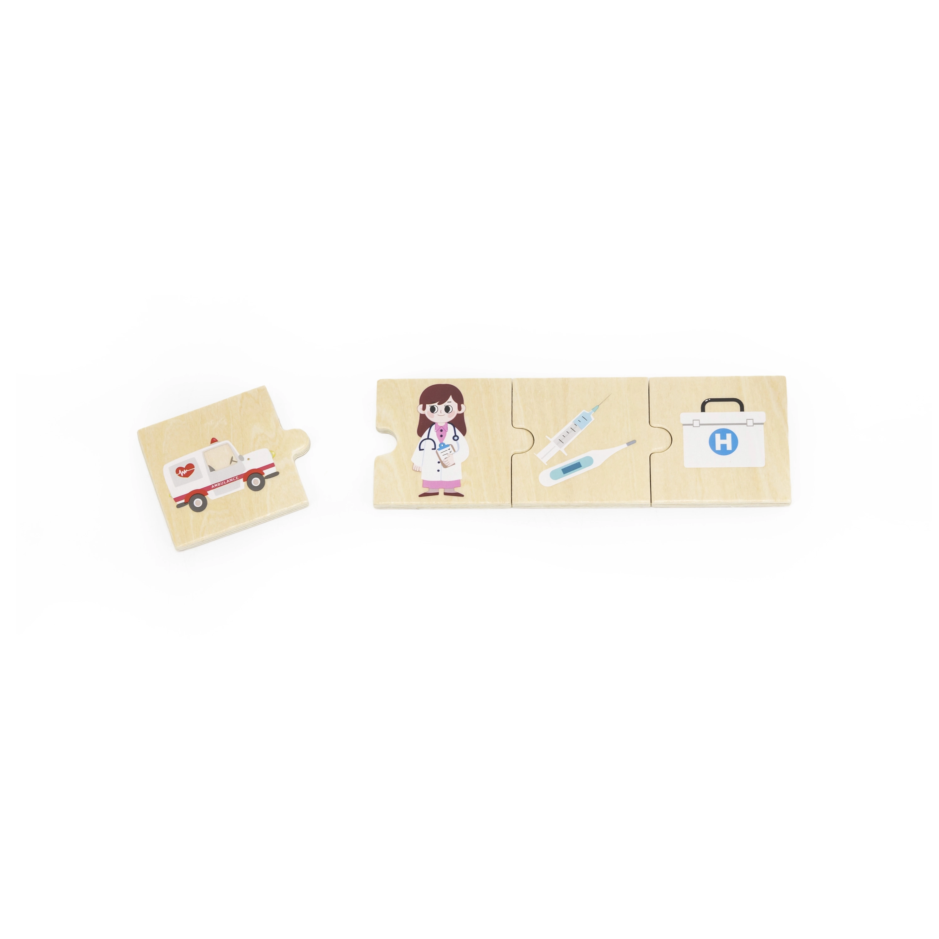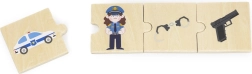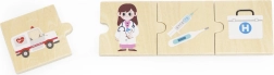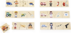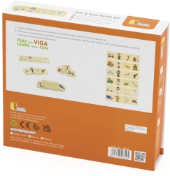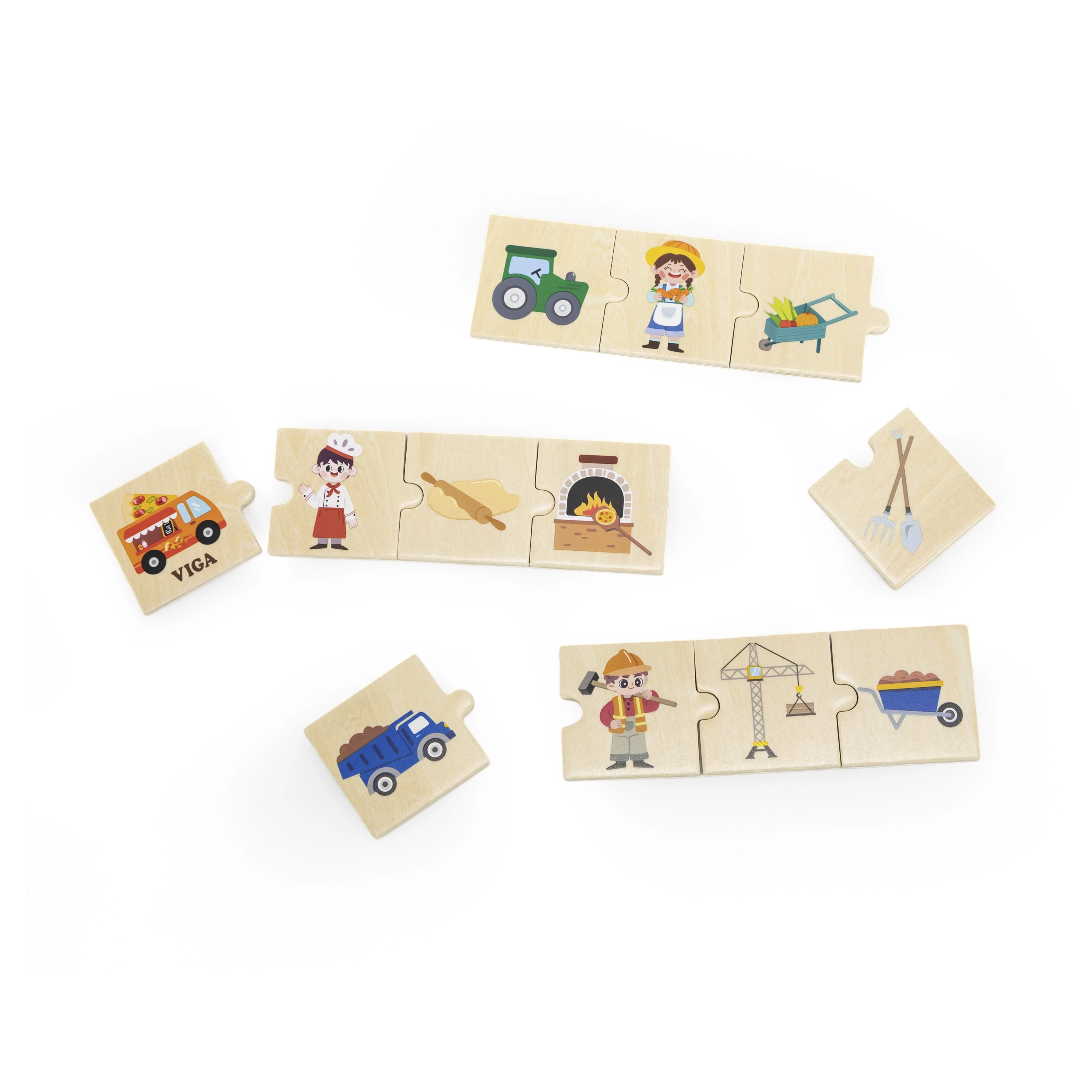 El set educativo infantil VIGA incluye 24 piezas de madera con bellas ilustraciones, gracias a las cuales los niños conocen de forma lúdica 6 profesiones —por ejemplo, bombero, médico, policía, agricultor, constructor o panadero— y les asignan las herramientas y vehículos correctos. Las imágenes coloridas apoyan el aprendizaje de nuevas palabras y amplían el vocabulario.