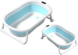 Práctica bañera plegable para bebés en color azul que ahorra espacio y es ideal para baños pequeños y para viajar. Gracias a las patas antideslizantes se mantiene estable en cualquier superficie plana, los materiales seguros sin ftalatos son delicados con la piel del bebé y el gancho para colgar facilita el secado y el almacenamiento.