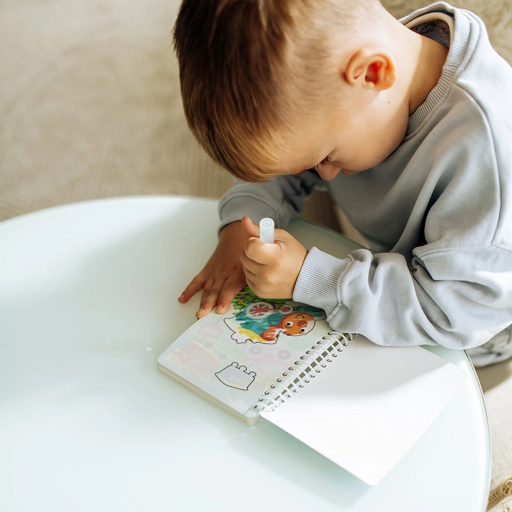 La encuadernación en espiral facilita pasar las páginas, y el tamaño compacto de 12 × 14 cm es perfecto para la mochila. La actividad desarrolla la motricidad fina, la coordinación mano-ojo y la creatividad sin riesgo de manchas.