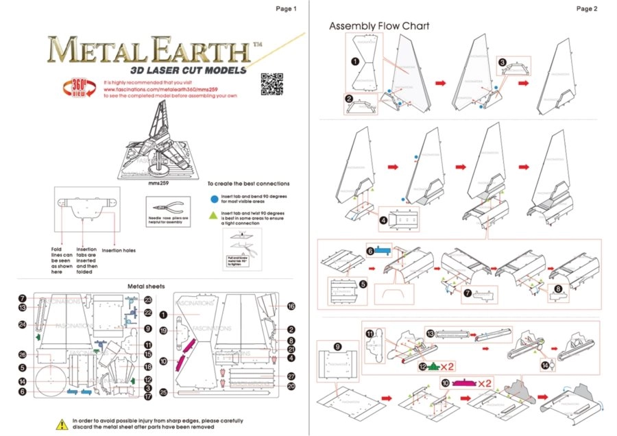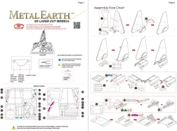 El kit incluye 2 láminas de acero con piezas y un manual ilustrado. El montaje se realiza sin pegamento: las piezas se conectan mediante cierres y lengüetas dobladas. Se recomienda trabajar con alicates pequeños y corta alambres (no incluidos).