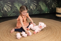 El set de peluches Cerditos con Mamá ofrece un material muy suave y agradable, ideal para abrazar y jugar. La mamá tiene en la barriguita una cremallera que permite descubrir a los cerditos escondidos dentro, lo cual es excelente para el desarrollo emocional y de las habilidades de cuidado en los niños. Además, esta función es práctica para los viajes, ya que las crías pueden guardarse de forma segura.