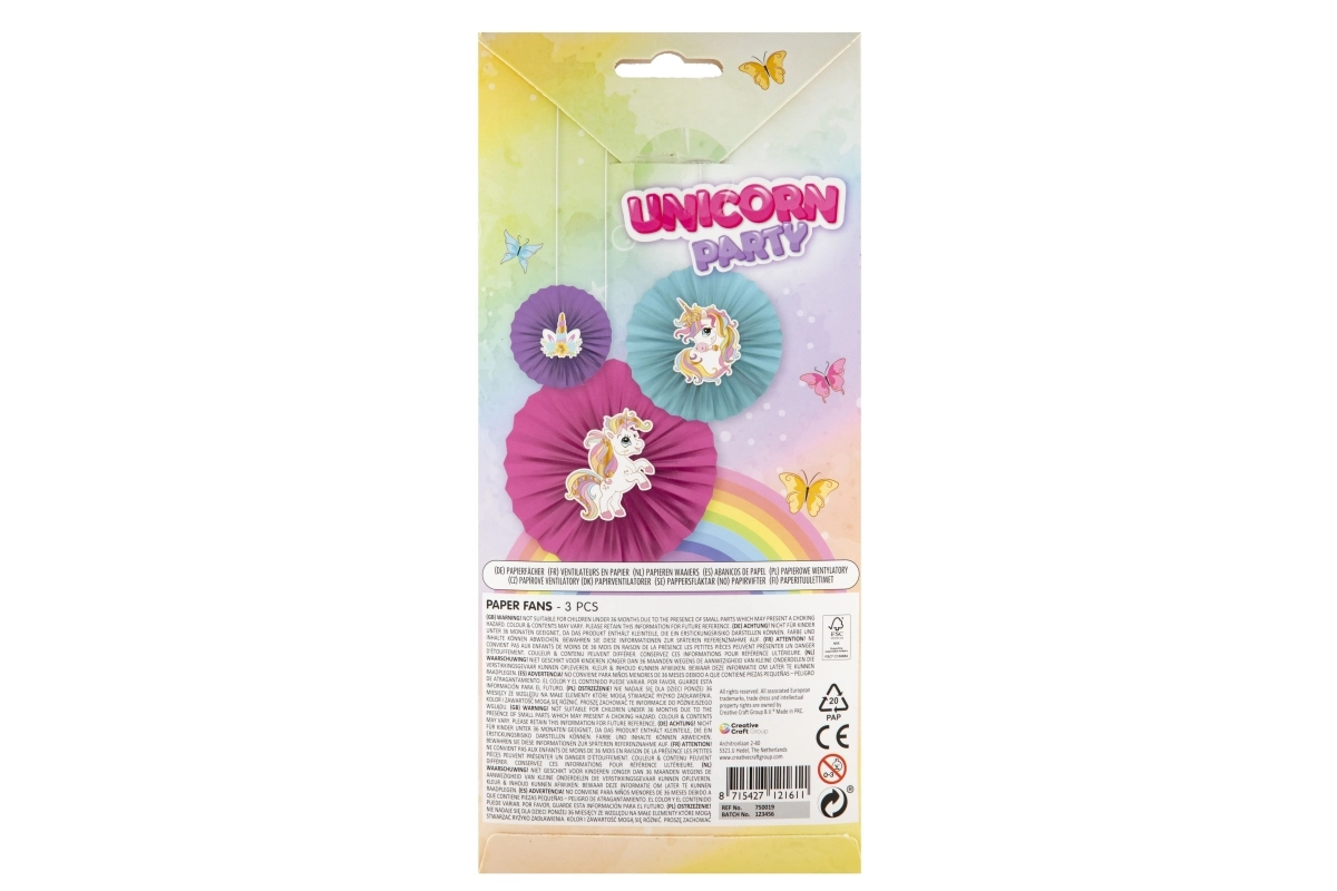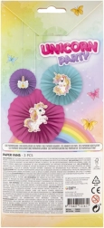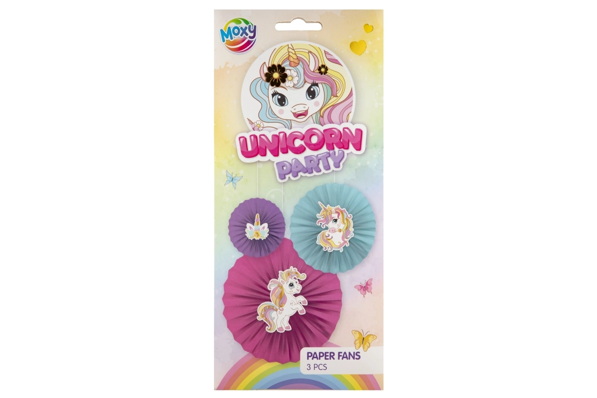 Decora cualquier celebración con un ambiente mágico gracias a estos abanicos de papel con motivo de unicornio. El paquete incluye 3 piezas de colores (rosa, azul, lila), ideales para decorar cumpleaños infantiles, fiestas temáticas y photocalls.