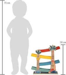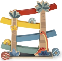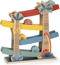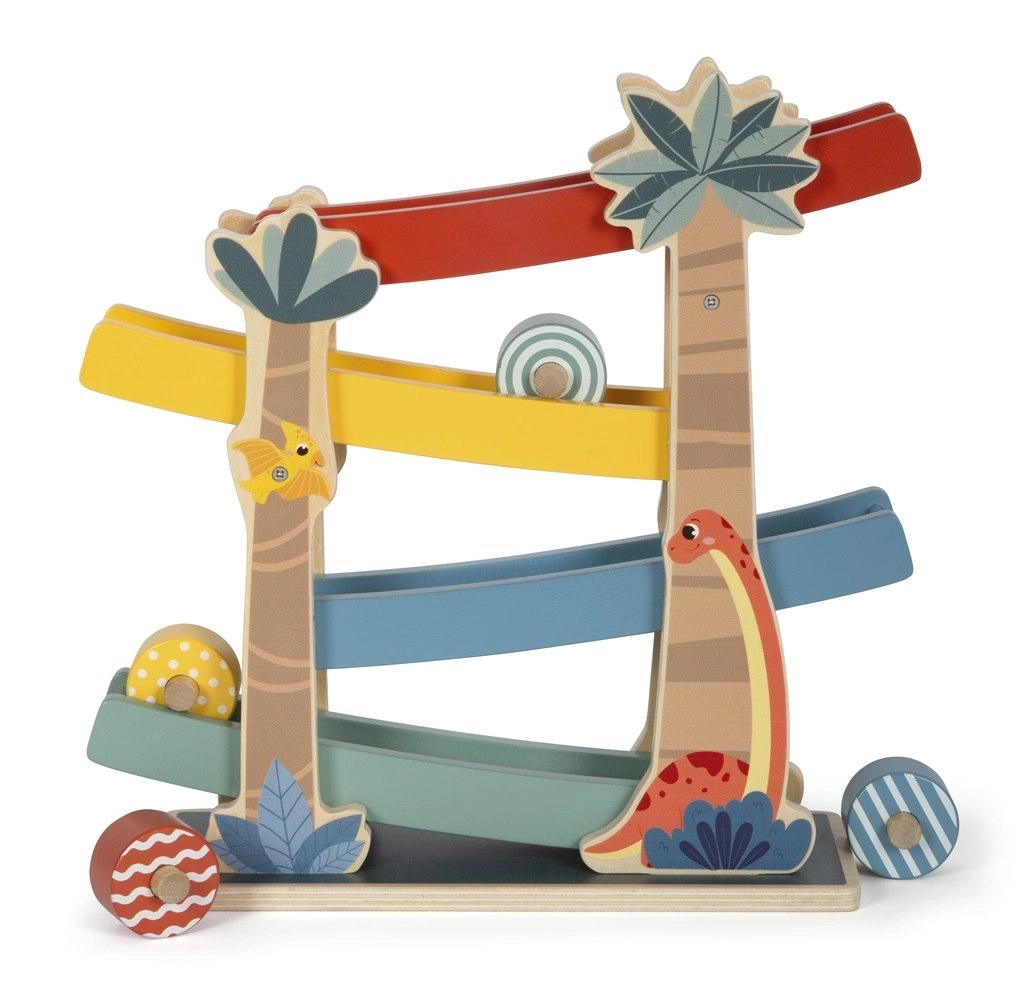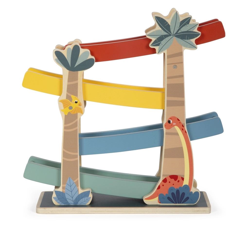 Esta pista de madera con temática de dinosaurios es un juguete interactivo ideal para niños. Junto con los discos estampados y de colores que ruedan por las rampas, ofrece una forma divertida de aprender sobre el movimiento y la gravedad. Características del producto: