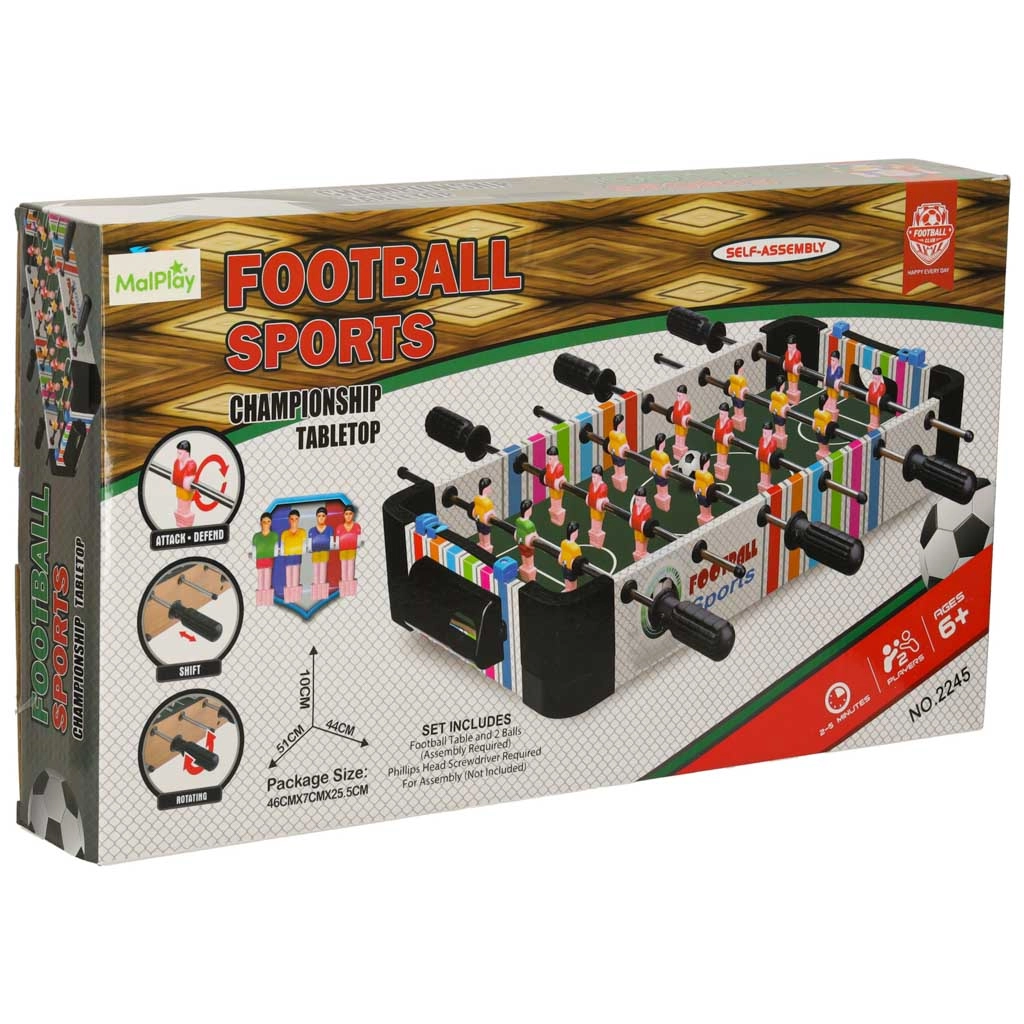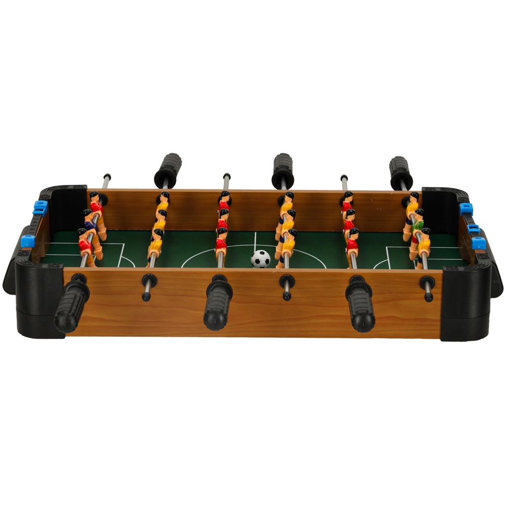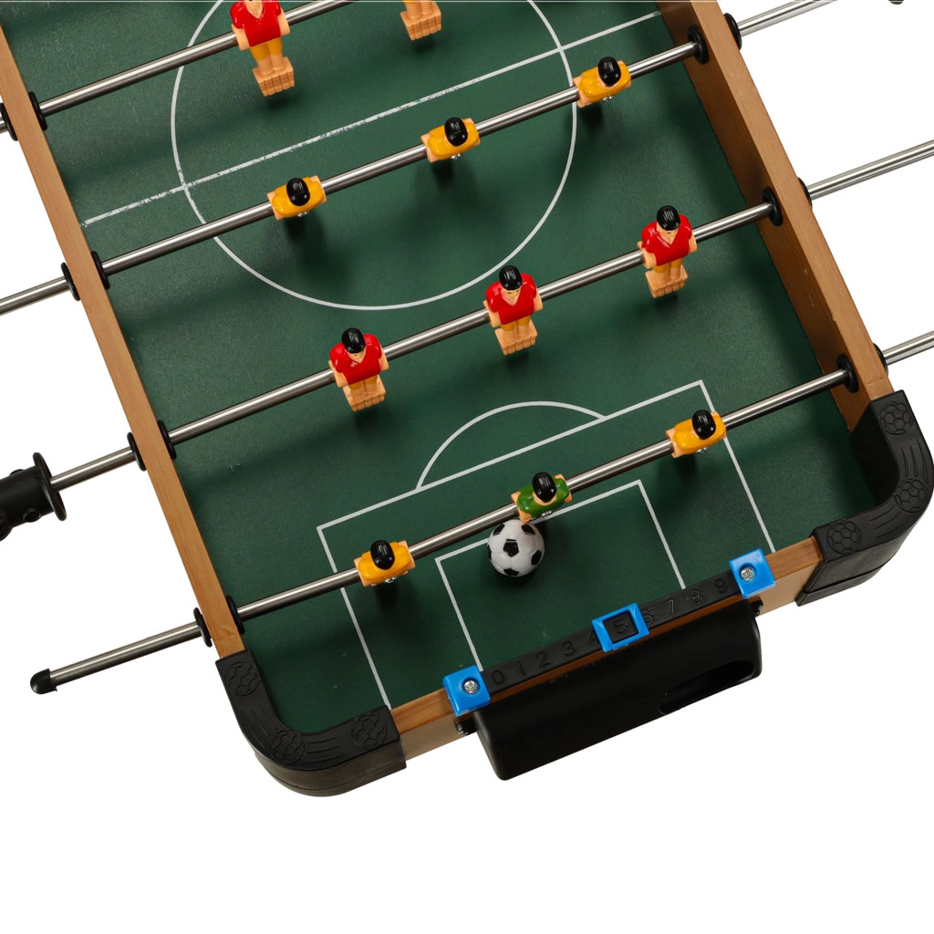 El futbolín de mesa en un tamaño práctico cabe en cualquier mesa y se transporta fácilmente. Gracias a su robusta fabricación en MDF y a las resistentes varillas metálicas con empuñaduras de plástico, disfrutarás de disparos rápidos y precisos, ya juegues con niños, familia o amigos. Ideal para torneos en casa y para entrenar el fair play.