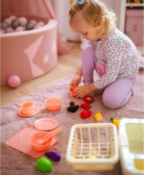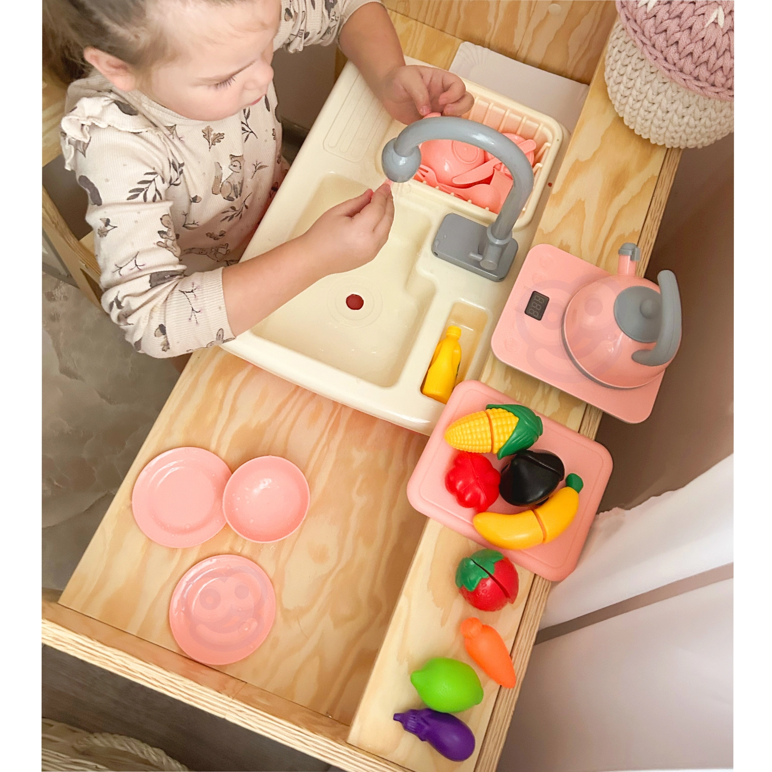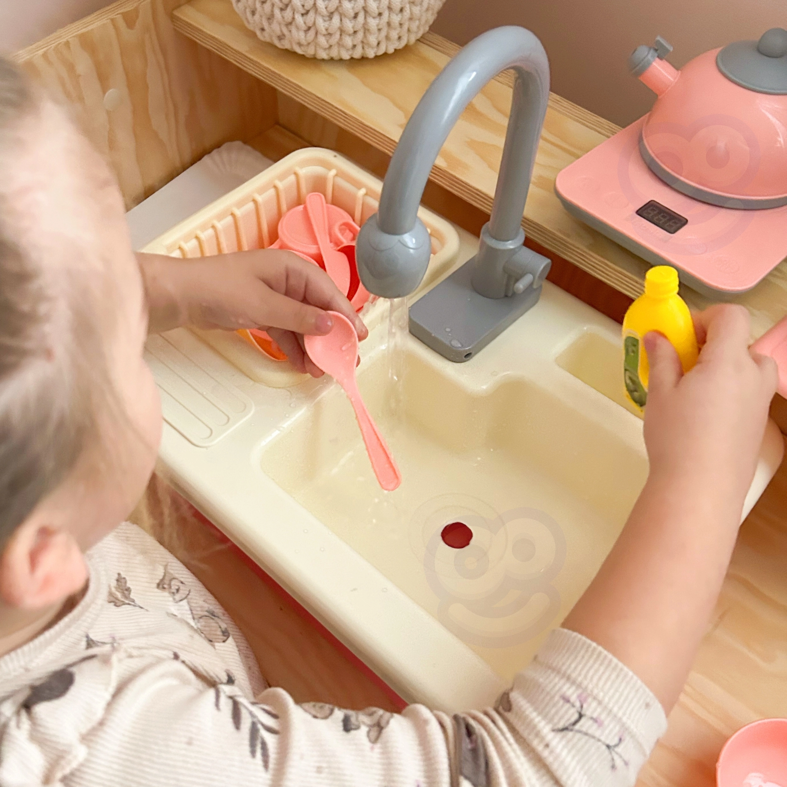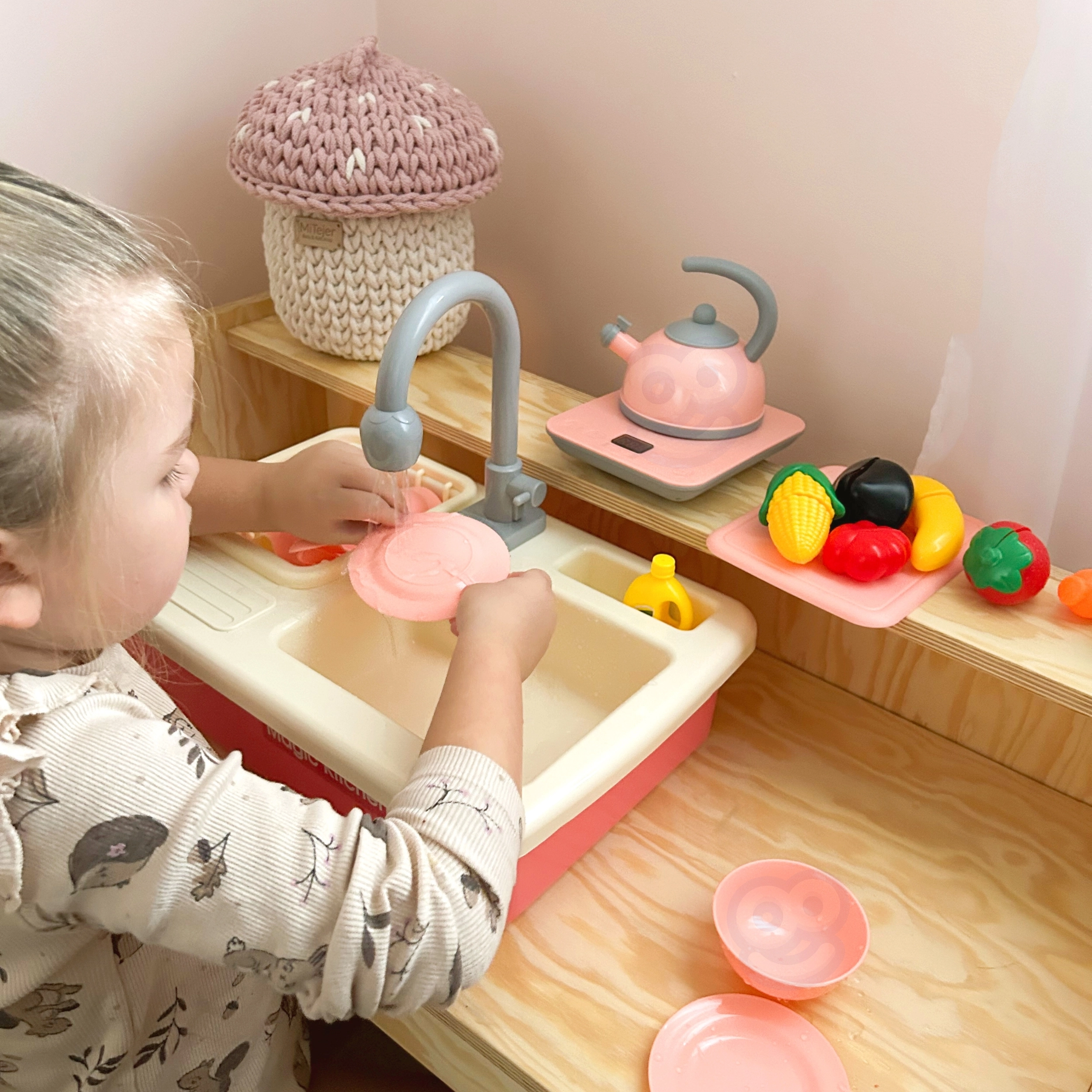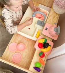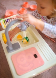Los niños pueden jugar fácilmente a ser cocineros y ayudantes en casa: servir, cortar, lavar y ordenar. Así adquieren de forma natural hábitos de higiene y un enfoque ecológico del uso del agua, mientras los padres aprecian una zona de juego más ordenada.