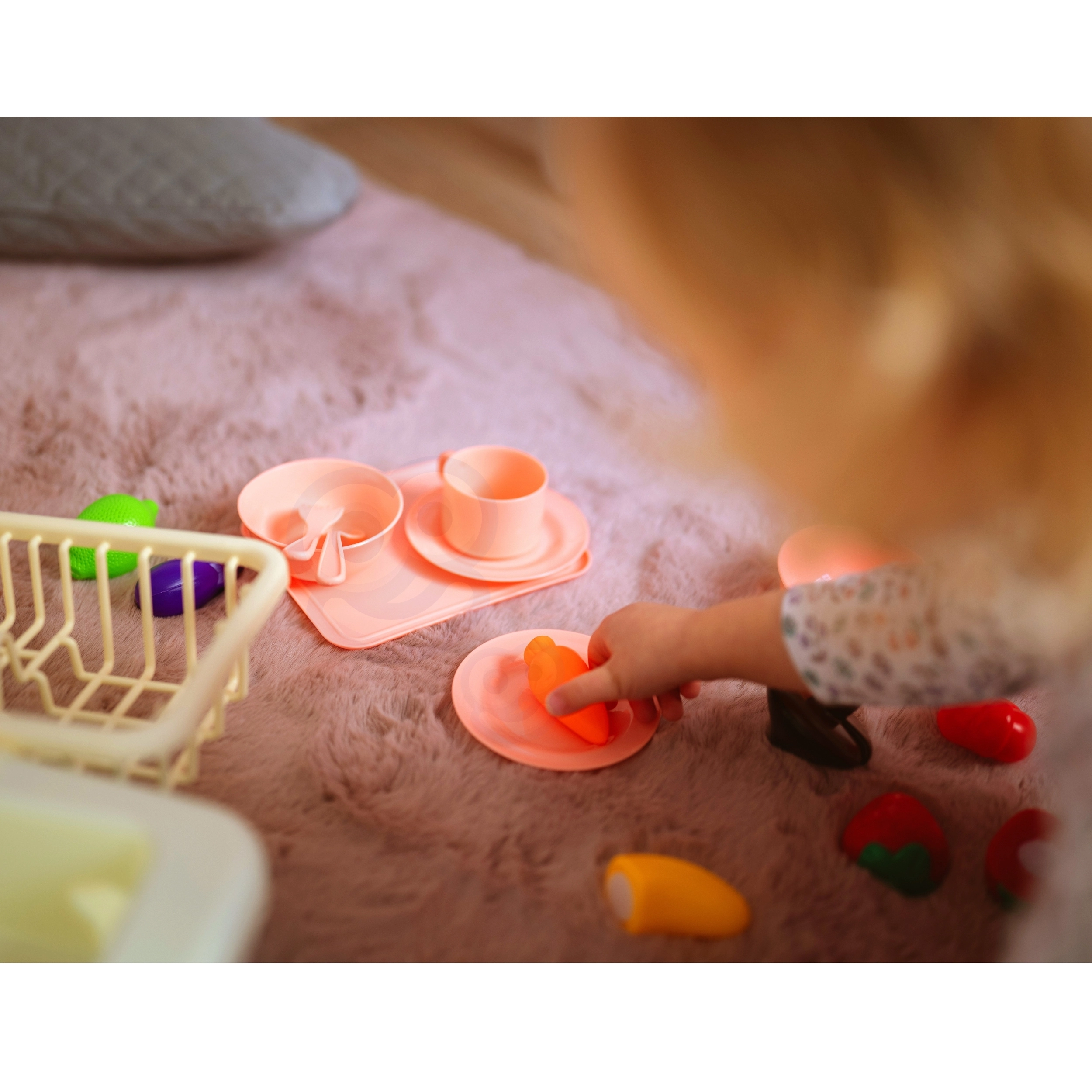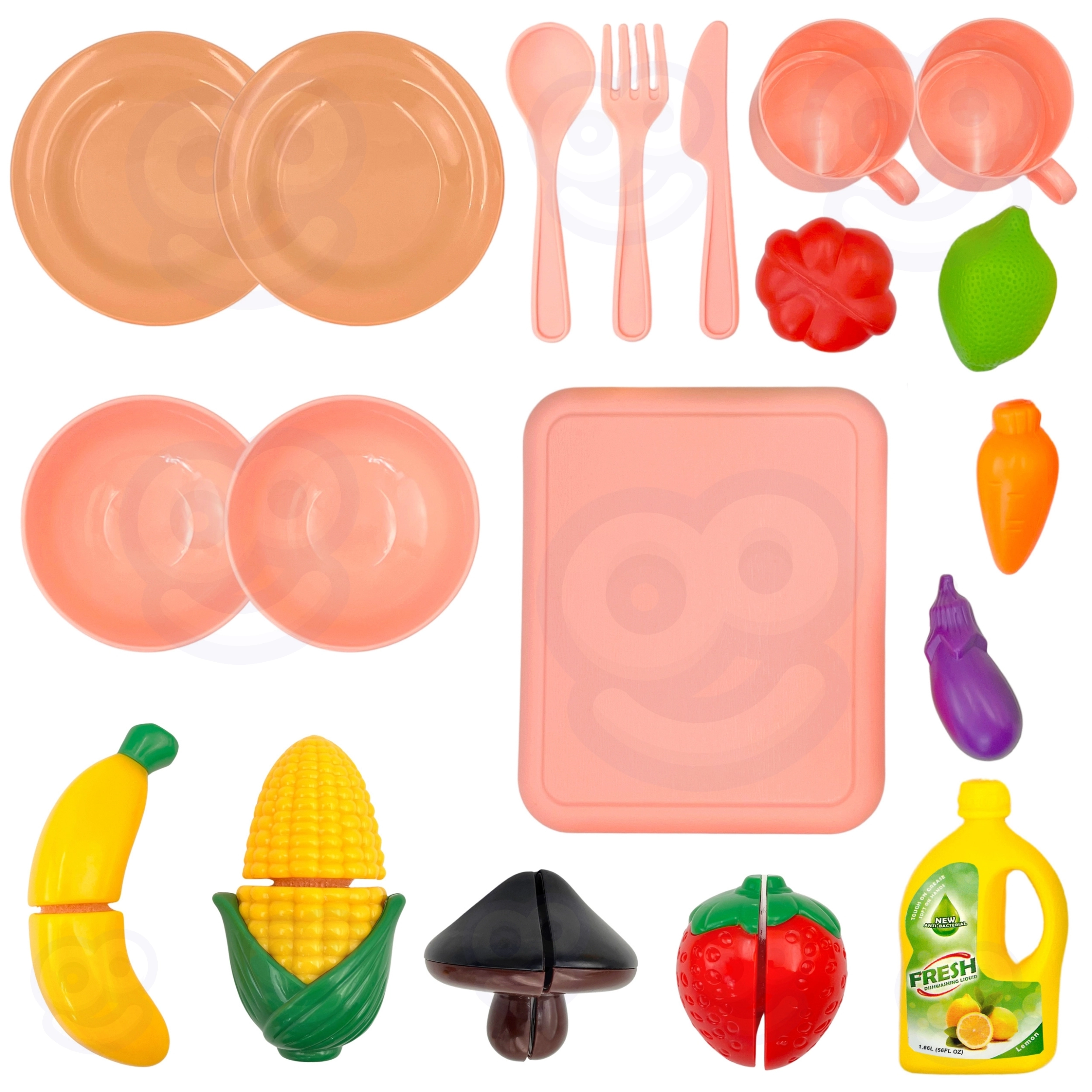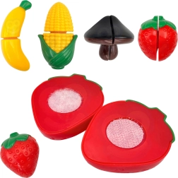 Platos, cuencos, tazas, cubiertos, jarrita y frutas y verduras para cortar con velcro: todo para un servicio realista y la limpieza después del banquete.