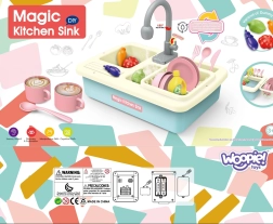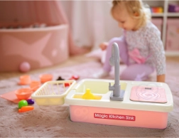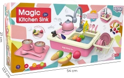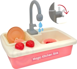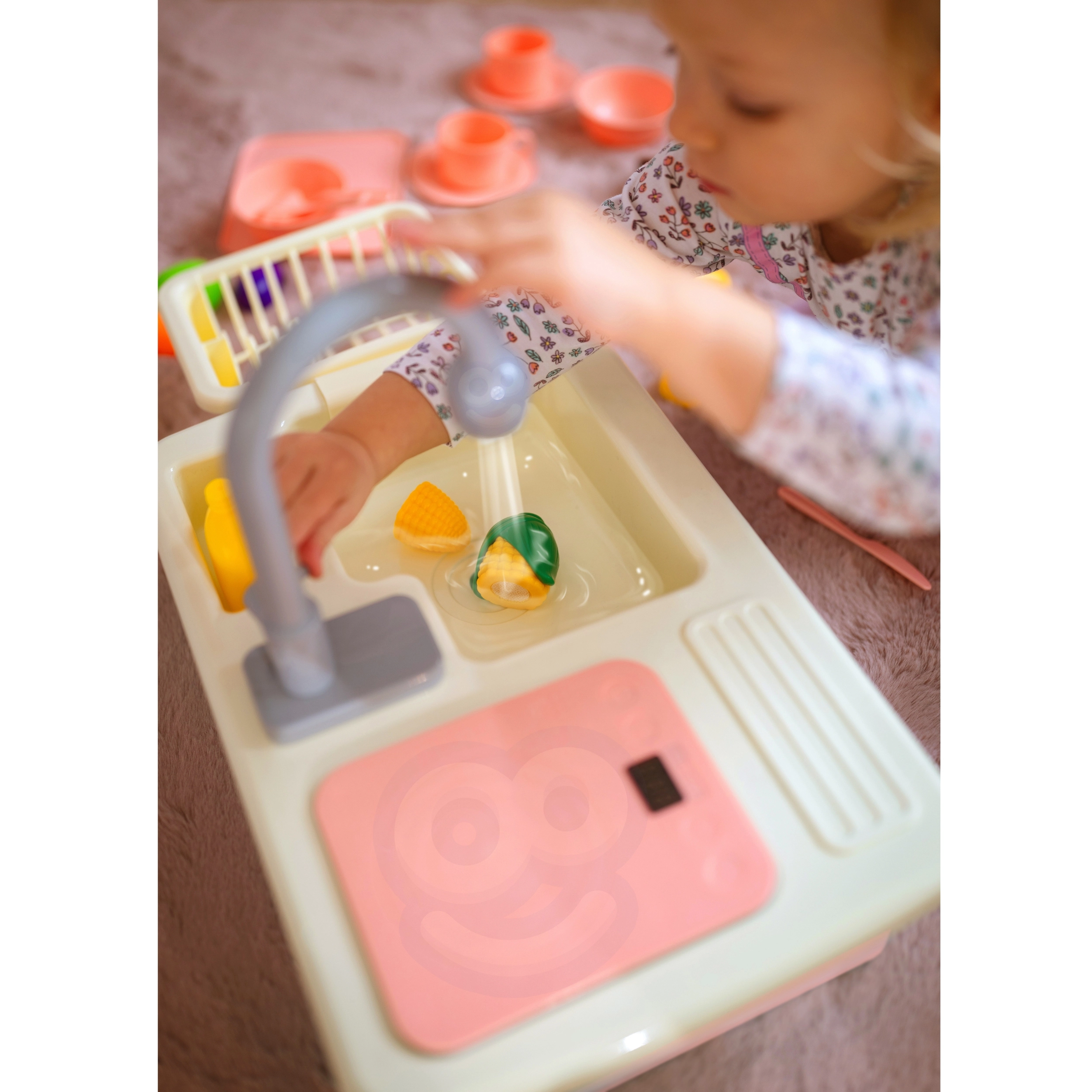 Descubre el fregadero interactivo que, al insertar 2× pilas AA, activa una bomba con circulación de agua: los niños pueden “lavar de verdad” los platos, enjuagar frutas y practicar un uso responsable del agua. El completo set de vajilla, alimentos para cortar con velcro y accesorios de cocina potencia la imaginación y las habilidades de coordinación.