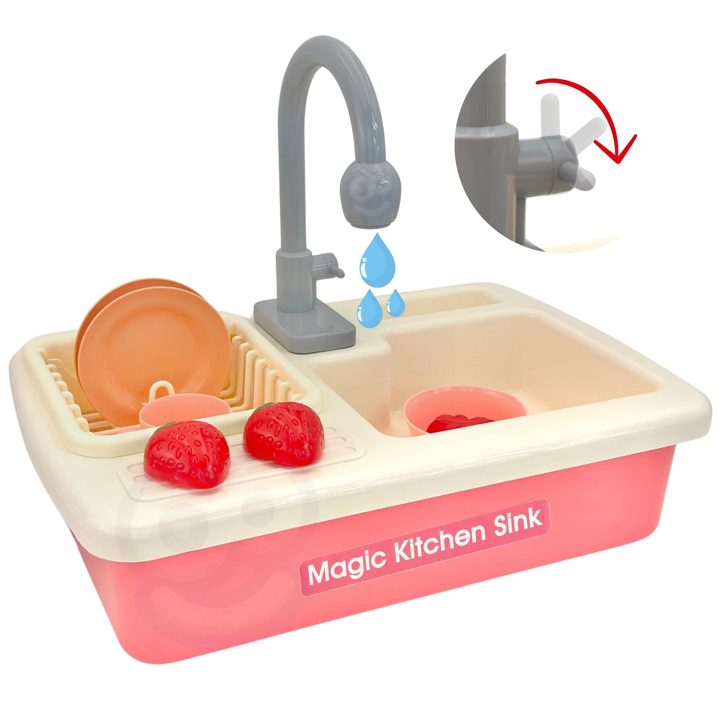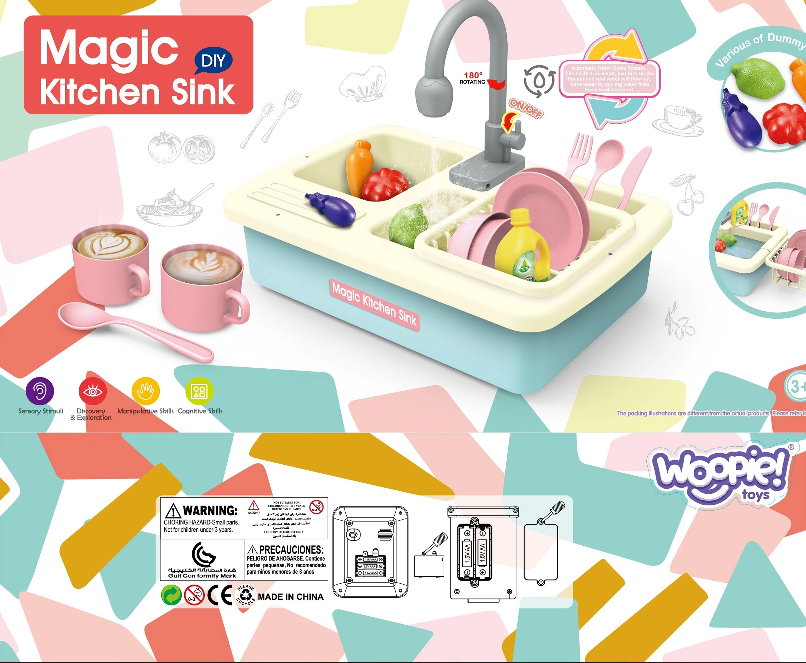 Tras colocar 2× pilas AA, la bomba hace circular el agua. Los niños practican el lavado de platos, el enjuague y el uso responsable del agua de forma divertida.