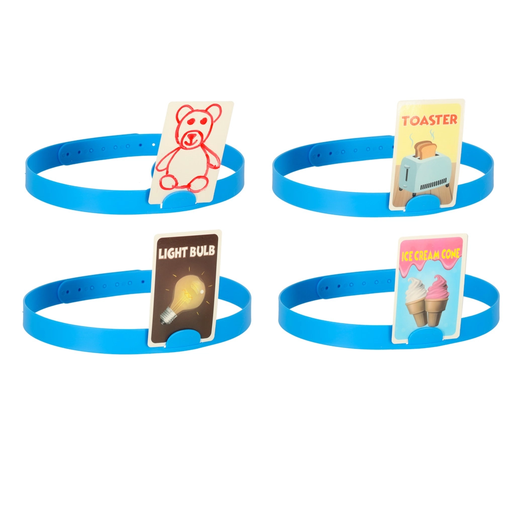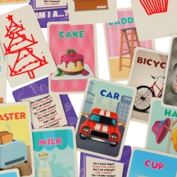 El juego incluye 42 tarjetas con imágenes variadas y textos en inglés. Además, se incluyen 8 tarjetas en blanco para crear tus propias tarjetas de adivinanzas. El tiempo de cada ronda lo mide un reloj de arena, aportando dinamismo y espíritu competitivo al juego.