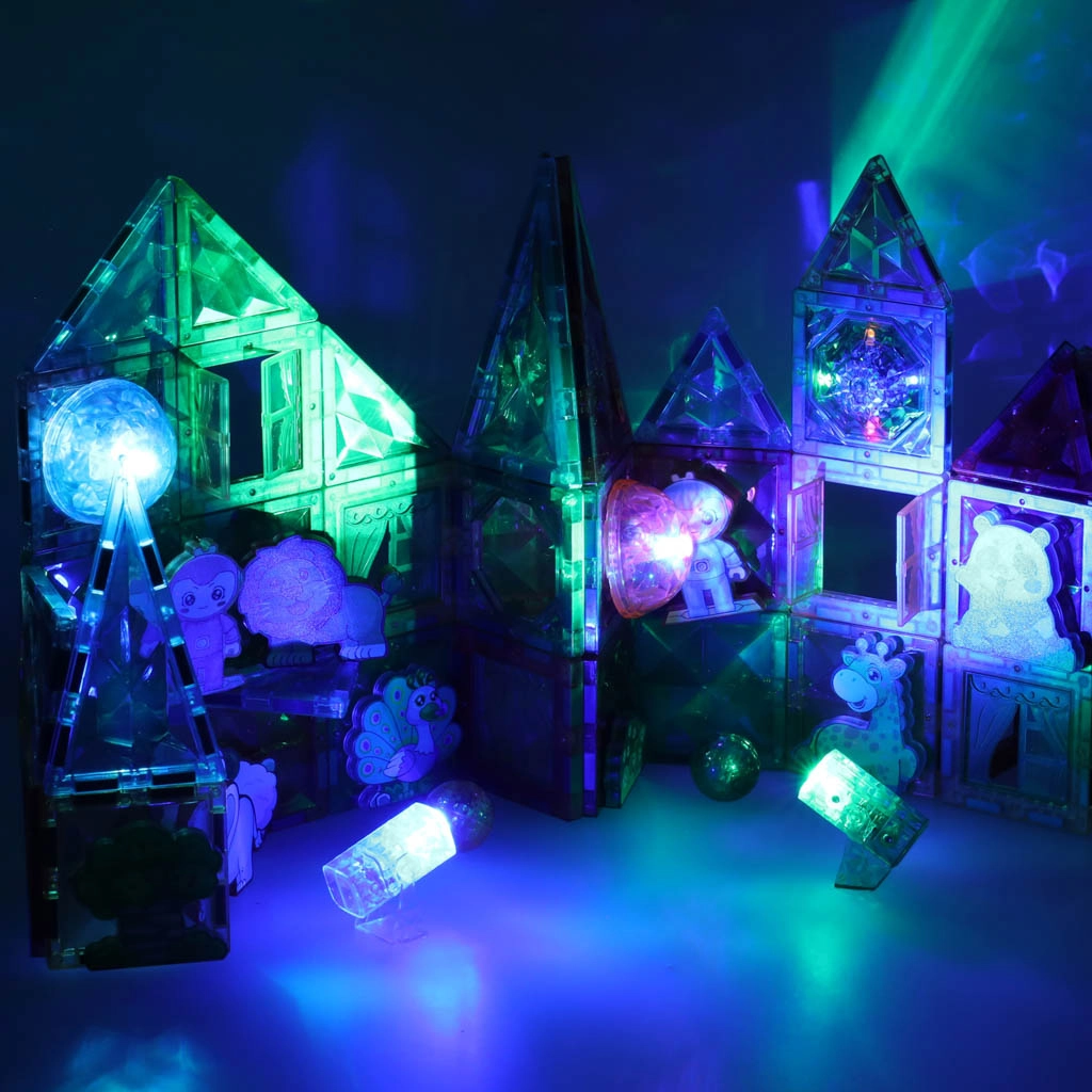 Con los bloques magnéticos luminosos, los niños pueden crear estructuras y construcciones variadas, desde sencillas formas 2D como animales y números, hasta sofisticadas construcciones 3D. Los bloques incorporan imanes que permiten un ensamblaje y desmontaje sencillos sin necesidad de aplicar fuerza. Además, algunos bloques se iluminan, lo que aporta atractivo a las construcciones, especialmente en la oscuridad.