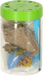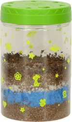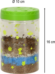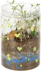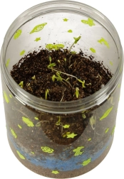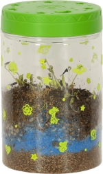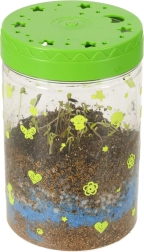 El recipiente de plástico transparente con orificios de ventilación es ideal para la siembra de las semillas incluidas. El paquete incluye tierra y piedras de colores que los niños colocarán siguiendo las instrucciones. Los LED en la tapa del terrario favorecen el crecimiento de las plantas, a la vez que aportan una suave iluminación nocturna.