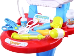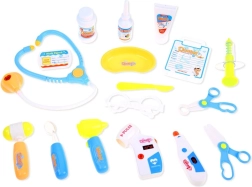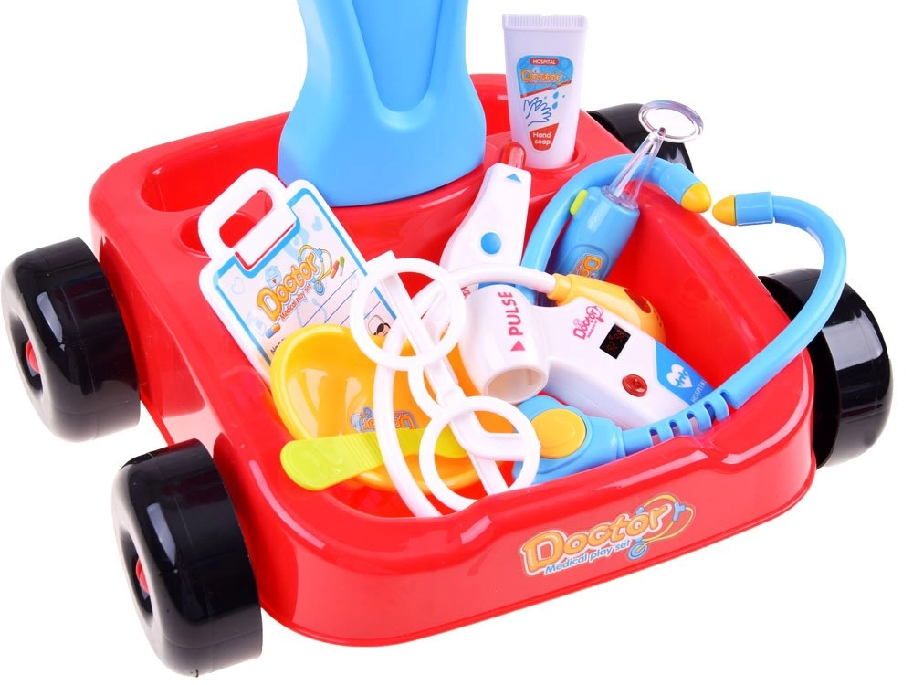 - Carrito con monitor, gafas, estetoscopio, termómetro con regulación y retroiluminación, otoscopio con luz, tensiómetro con regulación y retroiluminación, martillo neurológico, jeringa, espejo dental con luz, 2× tijeras, bisturí, cuenco, crema desinfectante de imitación, gotas para los ojos, bote de medicinas, credencial de médico, tarjeta del paciente