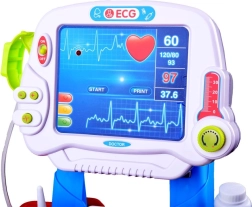 El monitor infantil muestra el trazado del ECG y acompaña el juego con luces y sonidos, aportando un toque realista al examen y manteniendo a los niños en acción.