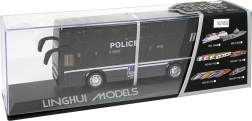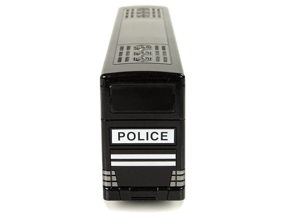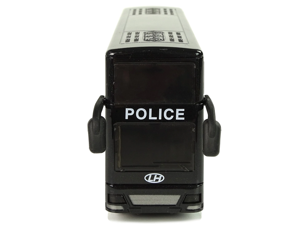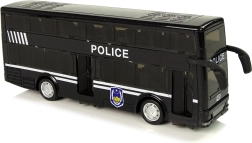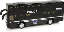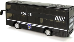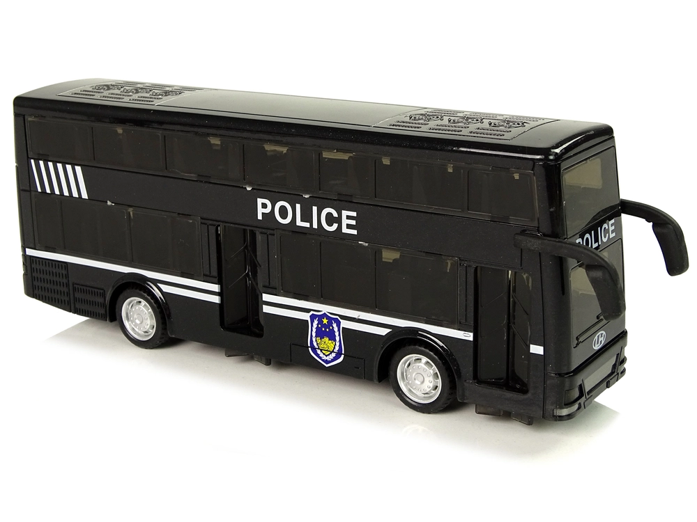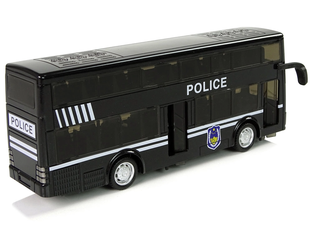 Autobús policial negro de dos pisos para niños con tracción por fricción (pull-back), efectos de luz y sonido y un interior detallado. Gracias a los neumáticos de goma, la conducción es suave, y los rótulos POLICE con emblemas aportan un aspecto atractivo. Juguete ideal para desarrollar la coordinación y la imaginación y un regalo perfecto en caja de regalo transparente.