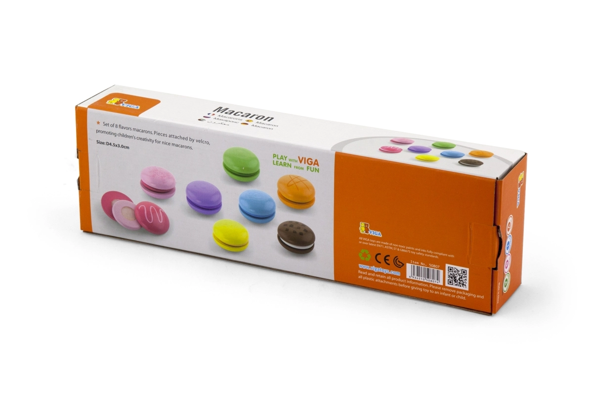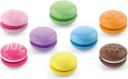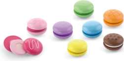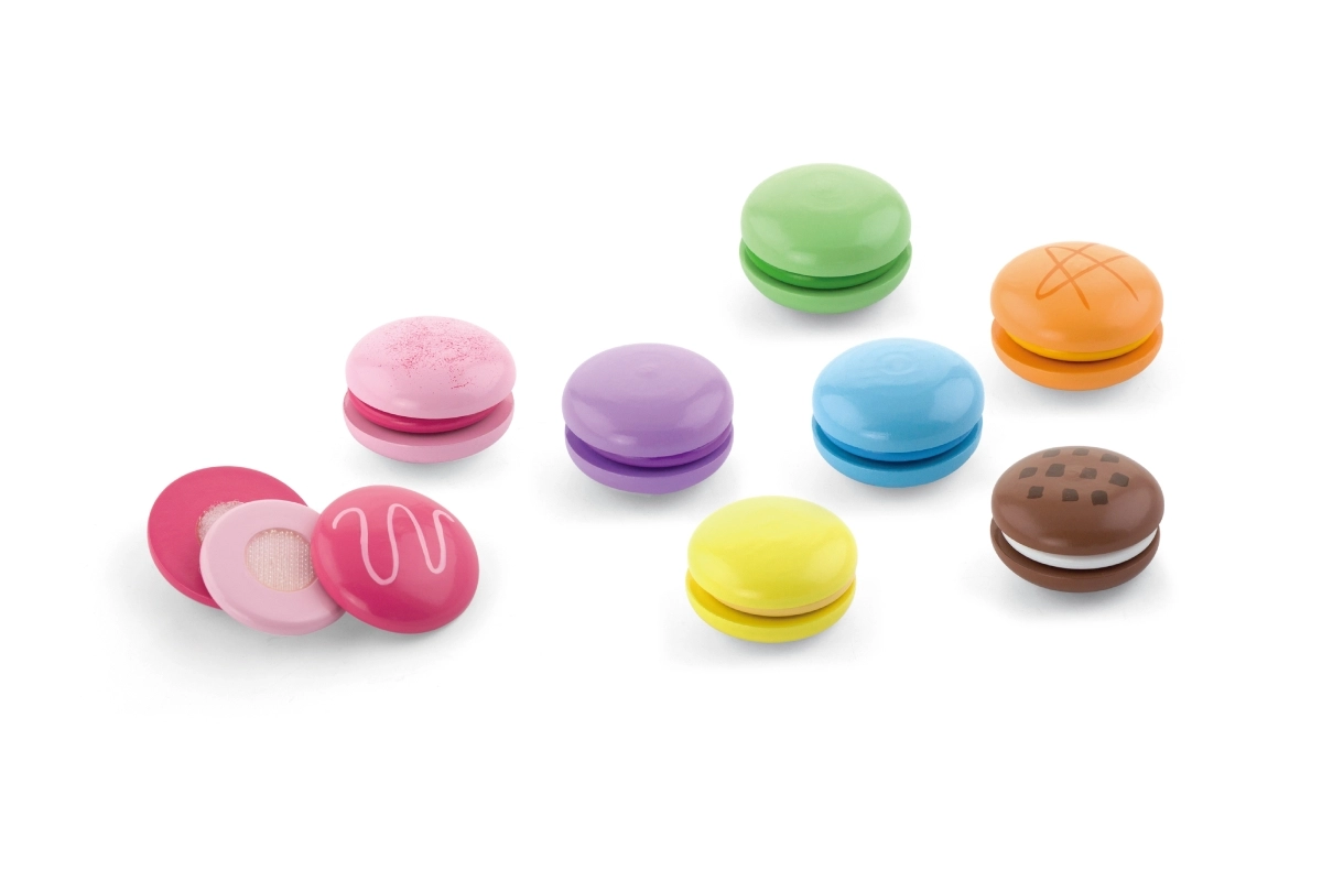 El set incluye 8 macarons con un acabado realista en suaves colores pastel. Cada macaron consta de dos partes unidas con velcro, para que los niños puedan “partirlos” fácilmente y volver a unirlos; así entrenan el agarre, la coordinación mano-ojo y descubren combinaciones de colores.