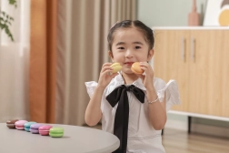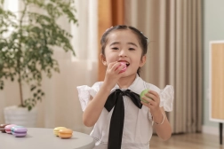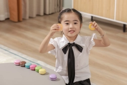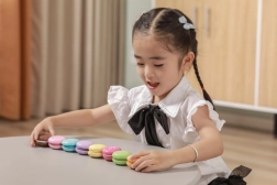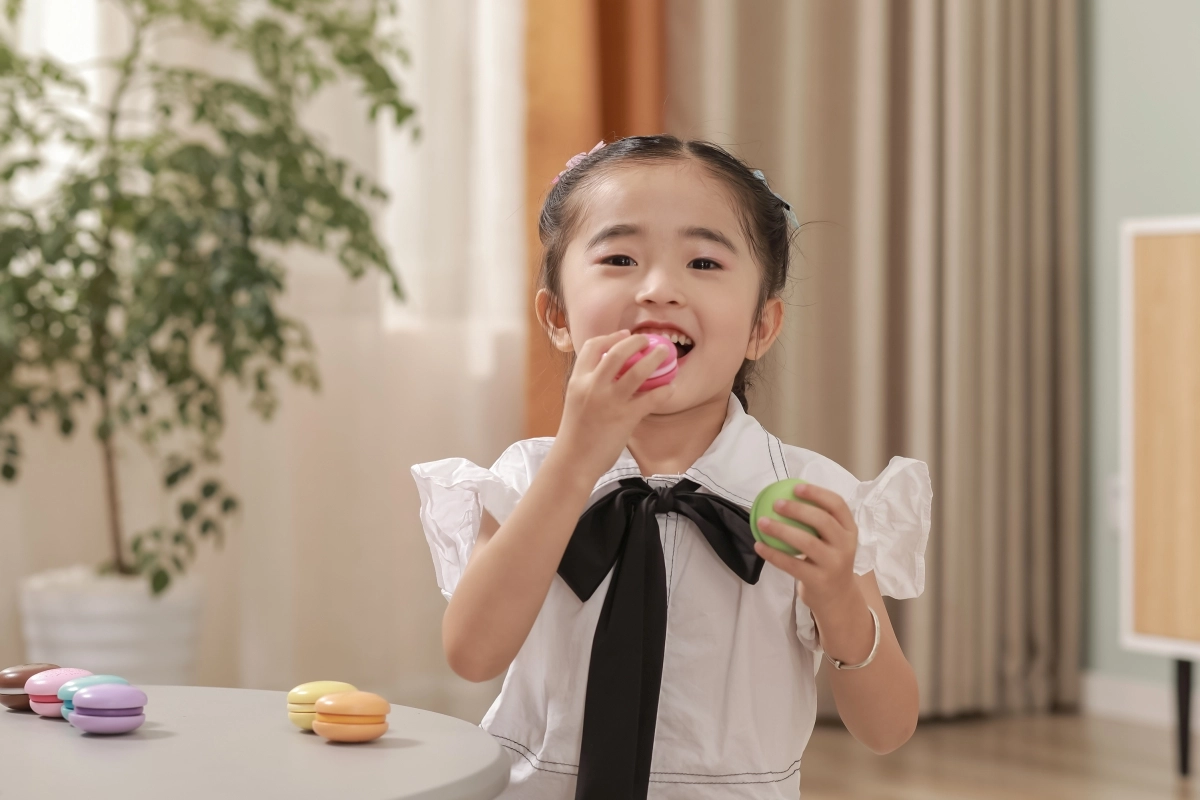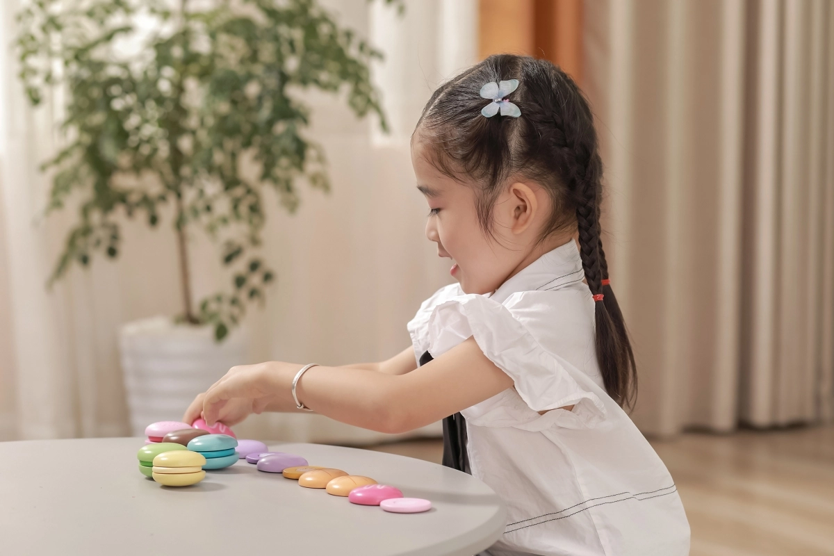 Las dos mitades de cada macaron están unidas con velcro: los niños pueden separarlas y volver a montarlas en nuevos “sabores”, entrenando los dedos y la coordinación.