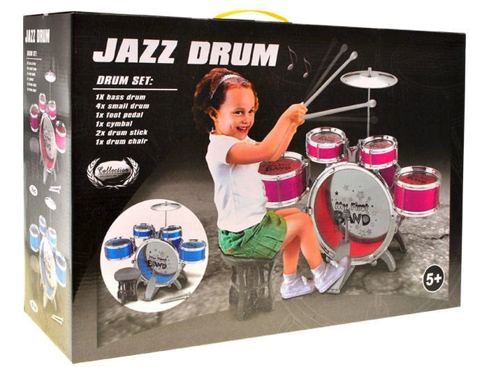 En el paquete encontrarás un bombo grande con pedal, dos tambores medianos y dos pequeños, un platillo metálico, un taburete y un par de baquetas. El conjunto viene en una caja de cartón, listo para hacer feliz a cualquier pequeño baterista.