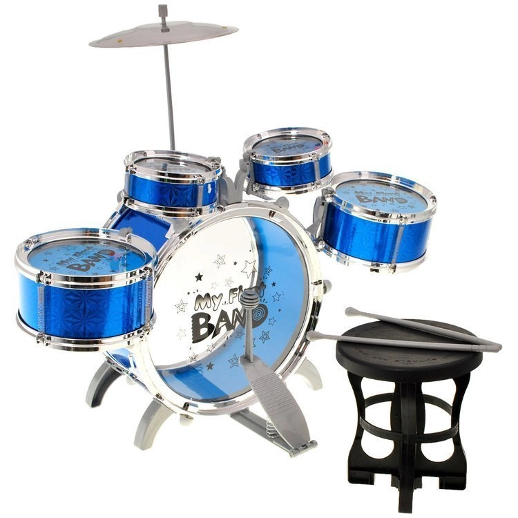 El set incluye 5 tambores, platillo, pedal, taburete y 2 baquetas: todo lo que un niño principiante necesita para tocar.