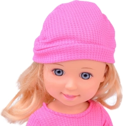 La blusa rosa, la falda morada y el gorro rosa dan a la muñeca un aspecto elegante, ideal para el juego de moda.