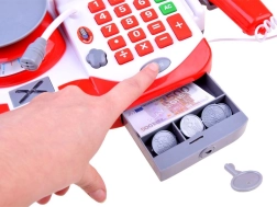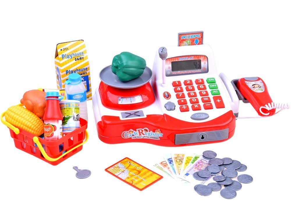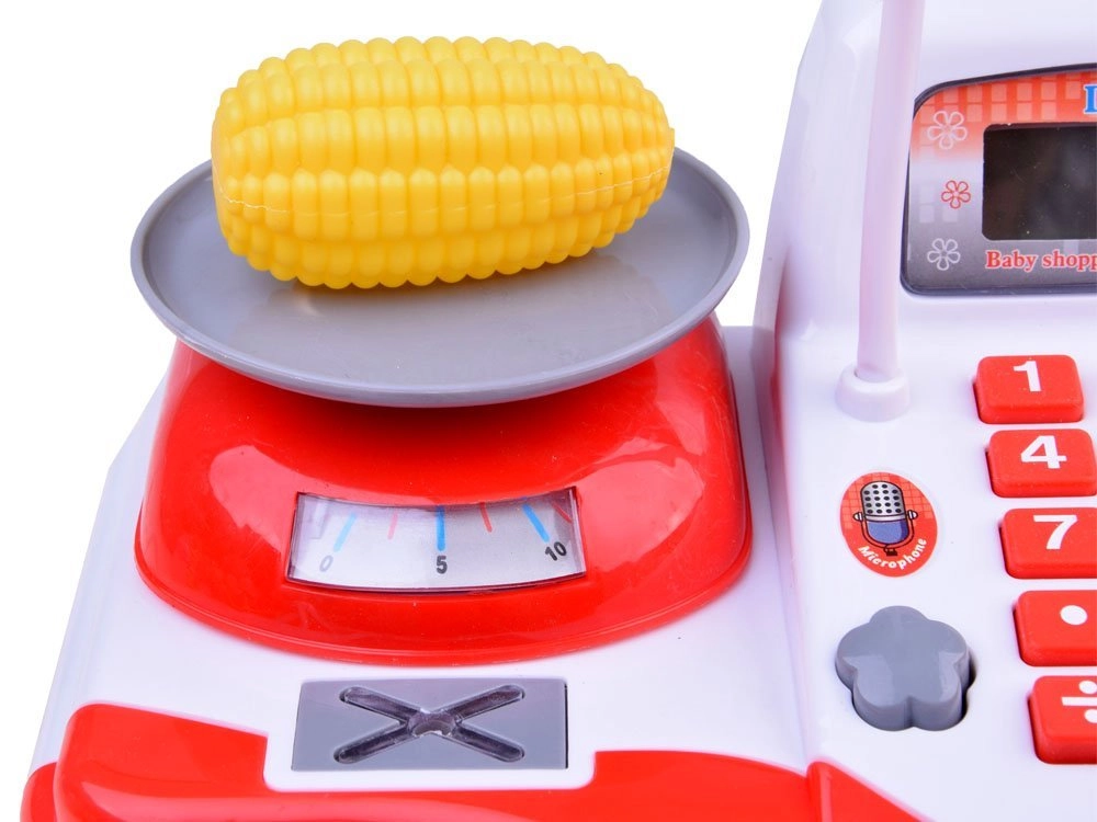 Esta caja registradora infantil ofrece todo lo que un pequeño vendedor necesita: una calculadora funcional para cálculos básicos, un escáner con luz y sonido, una báscula para los productos y un micrófono para hacer anuncios. El cajón del dinero se abre con el botón “open” y se puede cerrar con llave. Gracias a los abundantes accesorios, los niños pueden imitar fácilmente una compra real.