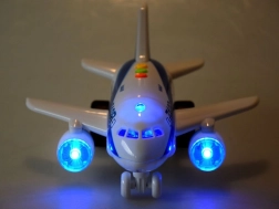 Este avión interactivo hará las delicias de cualquier niño que sueñe con volar. Gracias a la tracción por fricción (Friction power), tras un pequeño empujón el avión se desplaza con soltura sobre superficies lisas. Al pulsar los botones de colores en la parte superior activarás los efectos de luz en la cabina y los motores, la voz de la azafata en inglés y el sonido realista del avión.